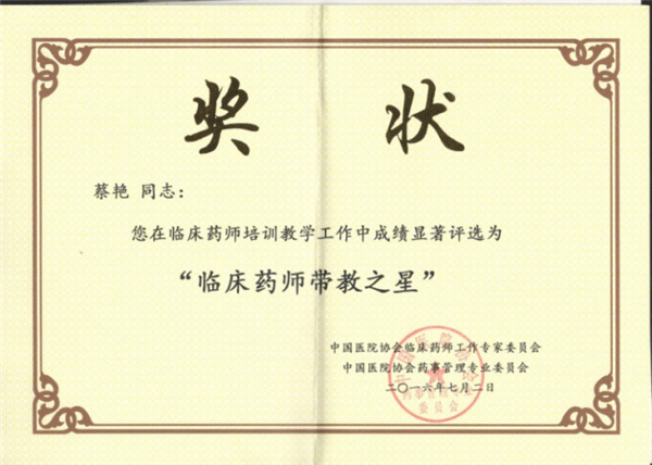 本次会议还对带教医师和带教药师进行了表彰。我院带教药师在培训中注意结合学员特点开展带教工作,开展“医师讲堂”,使用模拟药学查房的方式让学员初步建立信心后再开展面对患者的查房和问诊,分享特殊病例,促进学员共同进步。抗感染专业带教药师蔡艳荣获“临床药师带教之星”称号。