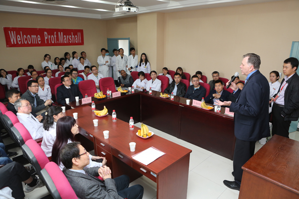 在医院综合大楼六楼示教室欢迎仪式上,院长贺西京教授全程英文为来宾介绍了我院的历史变迁,近年来在医教研全方位稳步发展的态势。Marshall教授对贺西京院长发言表示十分赞赏。在交流会上,Marshall教授风趣地回答了有关媒体记者的提问。