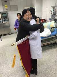 2月26日上午,一位患者家属走进抢救间,突然紧紧拥抱正在抢救室忙碌的李萍主治医师,并送来锦旗。正在值班的李萍医生被这突如其来的一幕给怔住了,只听到患者家属不断的感谢:“谢谢啊,太感谢了,要不是你,我妈现在还不知道怎么样呢?我姑娘说了,一定要来感谢李萍阿姨!是这样的,大年初二,我妈病重,其他医院不收,我们转院过来,在你们抢救室加床治疗的,就是李医生给我们看的病!多亏抢救及时……”说到这里,患者家属已泪流满面。
