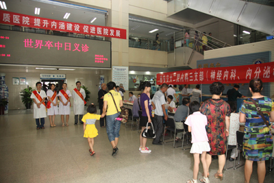 为纪念世界卒中日的设定,普及脑卒中防治相关知识,2013年6月23日,西安交通大学第二附属医院神经内科和内三党支部联合陕西省神经病学学会、陕西省科普学会在西安交大第二附属医院门诊大厅举行“关注脑卒中,立即行动”主题的脑卒中义诊活动。