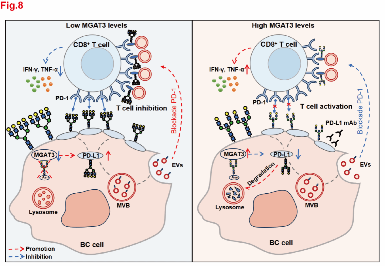 该研究证实MGAT3介导的平分型GlcNAc水平上调通过降低PD-L1稳定性从而下调其表达并阻碍PD-L1/PD-1相互作用,显著增强了CD8+ T细胞的抗肿瘤免疫效应。本研究的实施有助于揭示PD-L1表面平分型GlcNAc修饰对乳腺癌免疫的影响及其调控机制,以期为更精细的乳腺癌免疫治疗奠定基础。