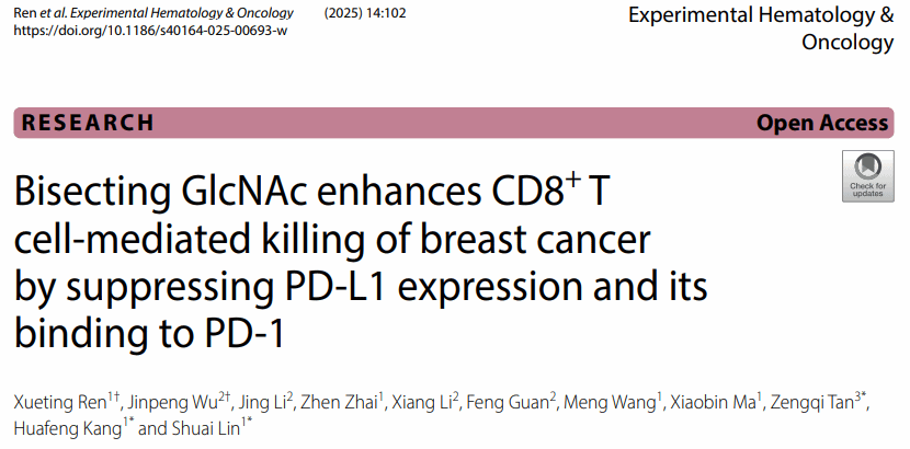 近日,西安交通大学第二附属医院乳腺疾病诊疗中心康华峰教授团队联合西北大学关锋教授团队的研究成果以《平分型GlcNAc调控PD-L1增强CD8+ T细胞杀伤乳腺癌的机制研究》(Bisecting GlcNAc enhances CD8+ T cell-mediated killing of breast cancer by suppressing PD-L1 expression and its binding to PD-1)(IF=13.5,Q1)为题,于近期发表在《实验血液学与肿瘤学》(Experimental Hematology & Oncology)。该研究首次阐明增强乳腺癌细胞中平分型GlcNAc修饰可通过促进PD-L1降解并阻断其与PD-1结合,从而显著提升CD8+ T细胞抗肿瘤免疫杀伤效能,为乳腺癌靶向糖基化修饰的联合免疫治疗提供新策略。