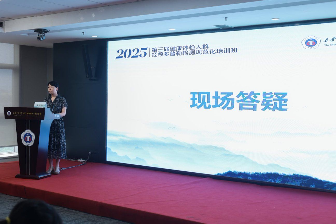 授课模块4:规范实操,答疑解惑。理论课程后,西安交大二附院翟妮娜老师与学员进行热烈的《现场答疑》环节,针对学员日常工作中的疑点难点进行了权威解答。徐晓霞老师随后进行《TCD常规检测规范及操作演示》,通过标准化的动作分解,为学员们实践操作树立了标杆。