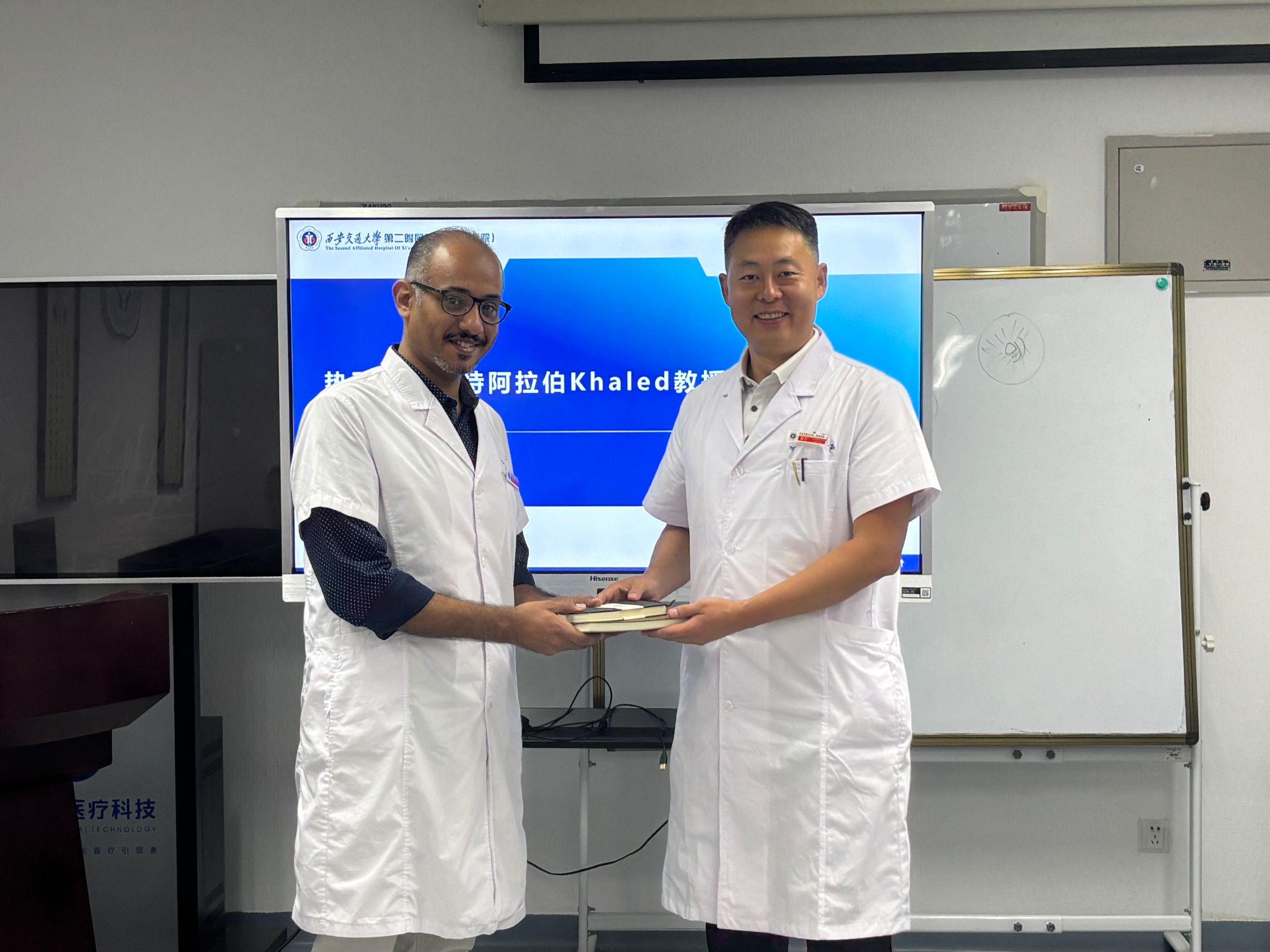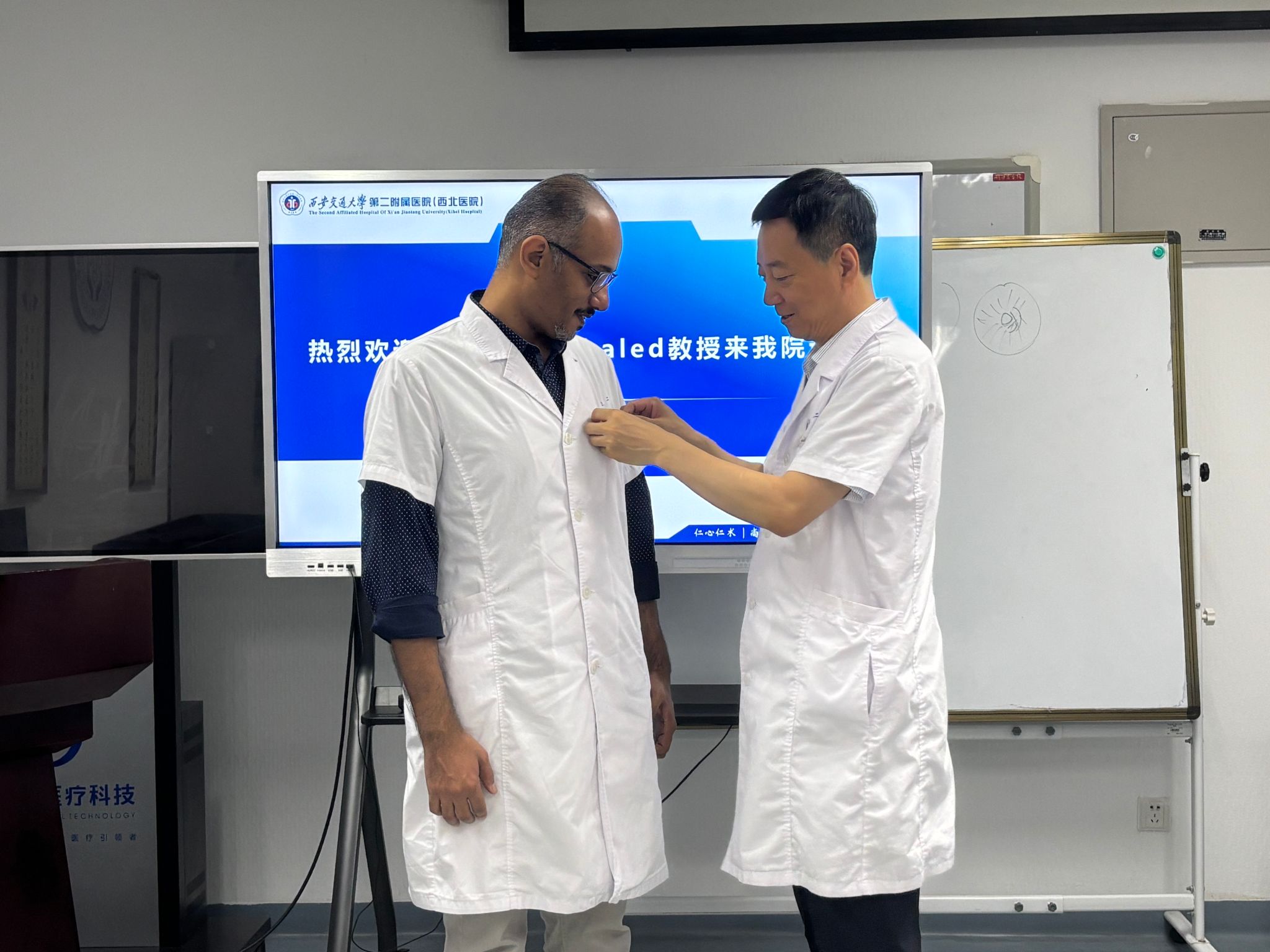 8月14日上午,一场热烈欢迎来自沙特阿拉伯的泌尿外科专家Khaled Bin Alshaibah医生的迎新会议在我院泌尿外科举行。我院副院长种铁出席会议,教务部副主任刘颖、泌尿外科主任薛力团队等共同参与,标志着我院继续教育工作在国际化医学交流与合作领域迈出重要一步。