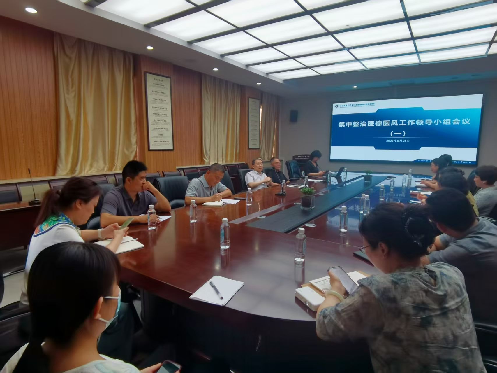 为深入贯彻落实中央和省卫健委关于集中整治医德医风有关问题的部署要求,8月26日下午,我院在宗濂会议室召开集中整治医德医风工作领导小组会议,统筹协调集中整治医德医风有关问题各项任务,将集中整治工作同党风廉政建设、清廉医院建设、大型医院巡查、“六个多”服务等重点工作结合起来,一体推进。滕文葆副书记、刘明副院长、集中整治医德医风工作领导小组全体成员参加会议,会议由刘明副院长主持。