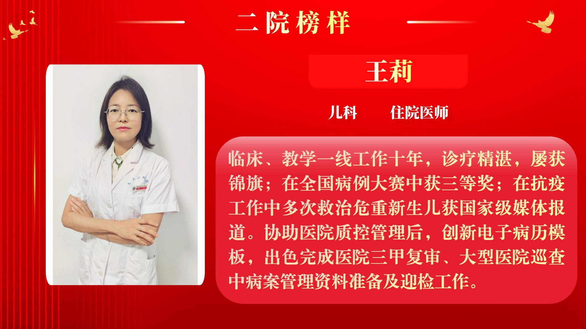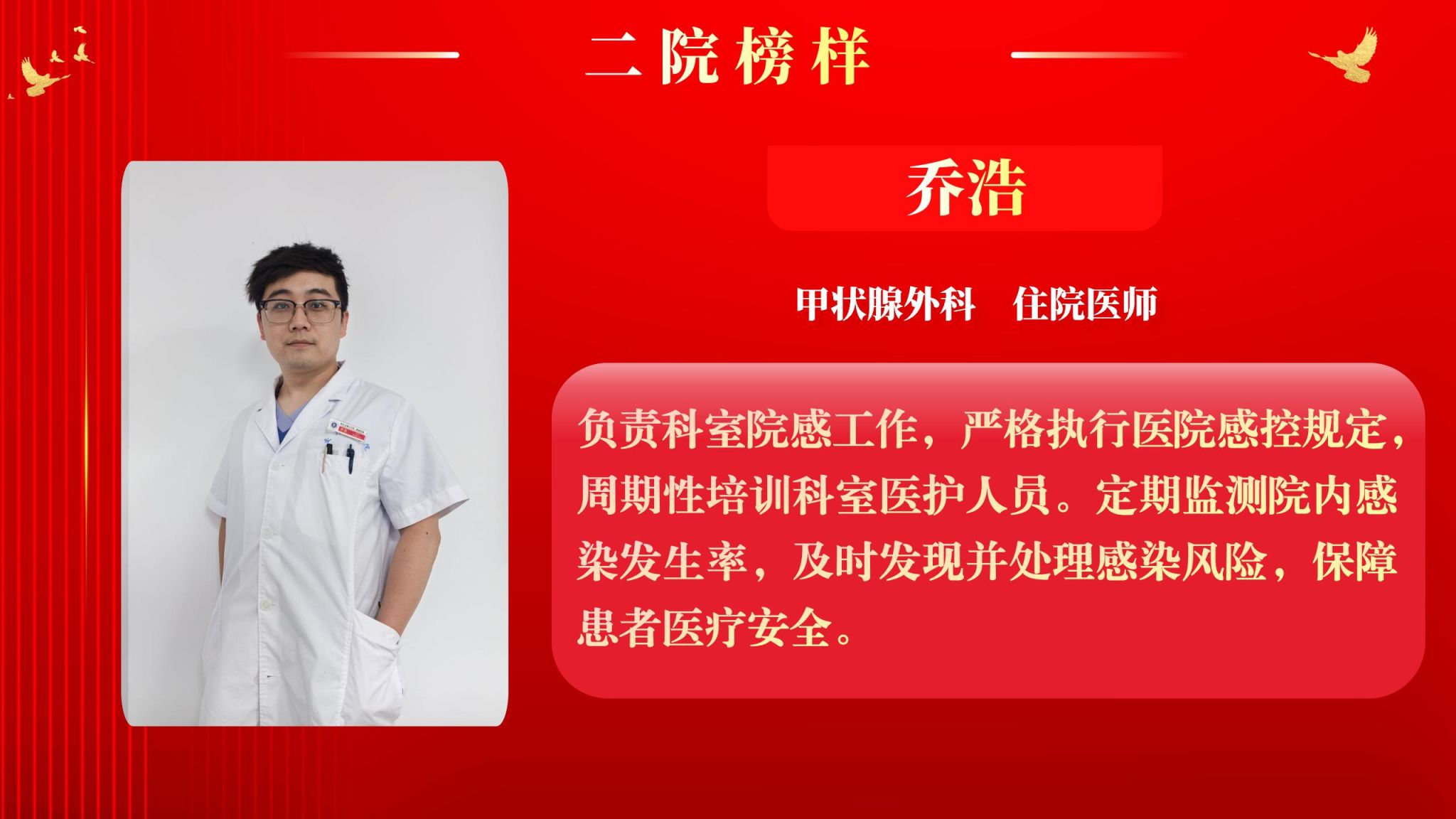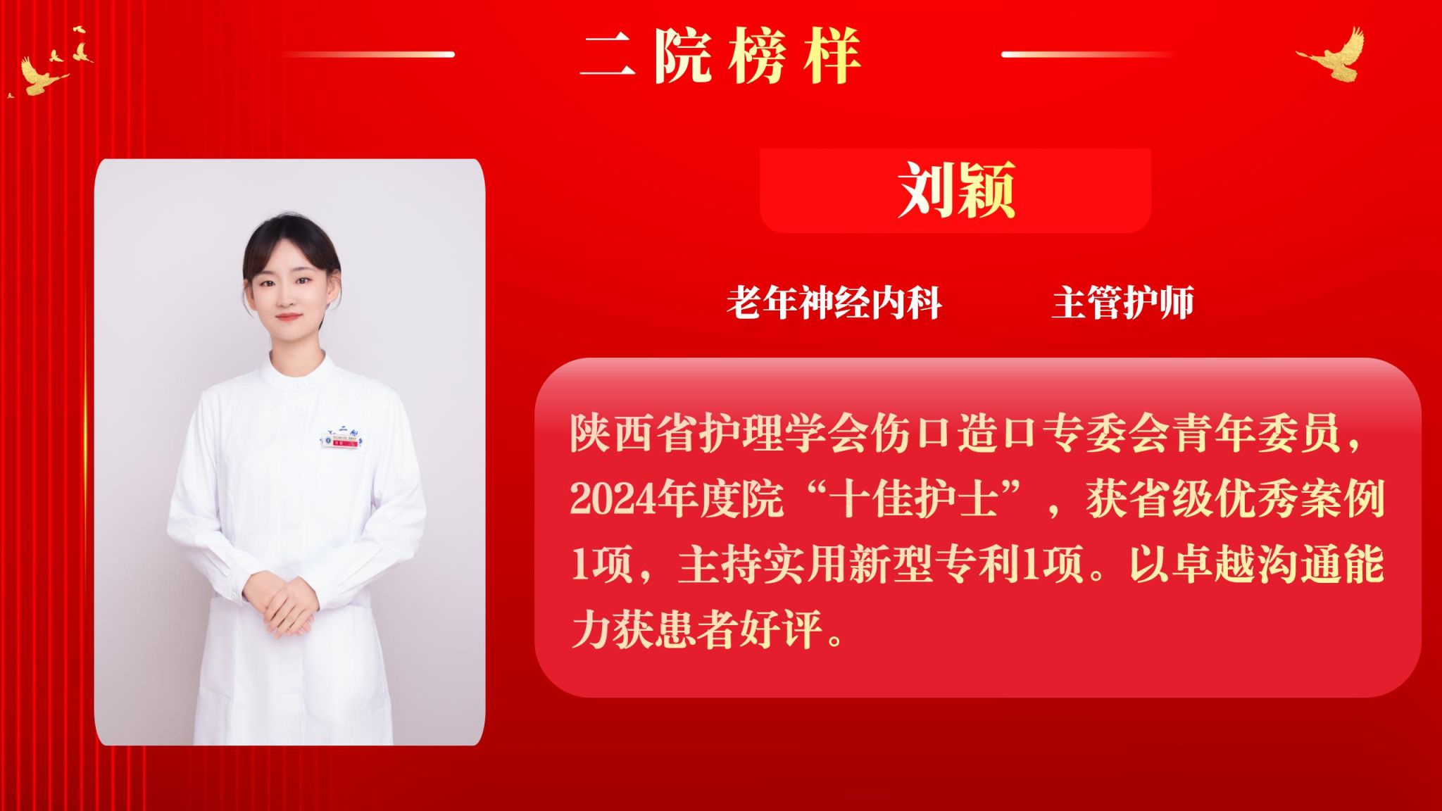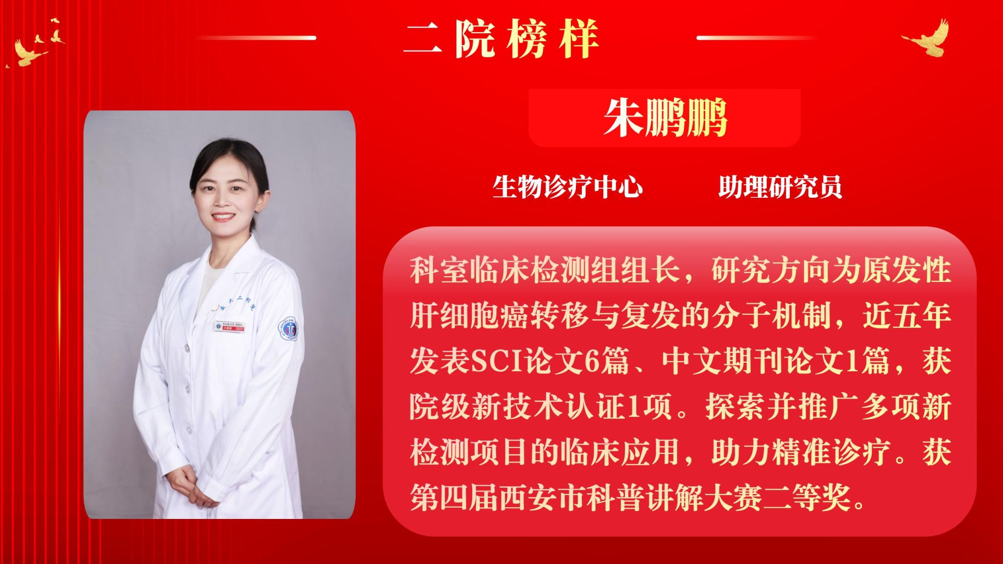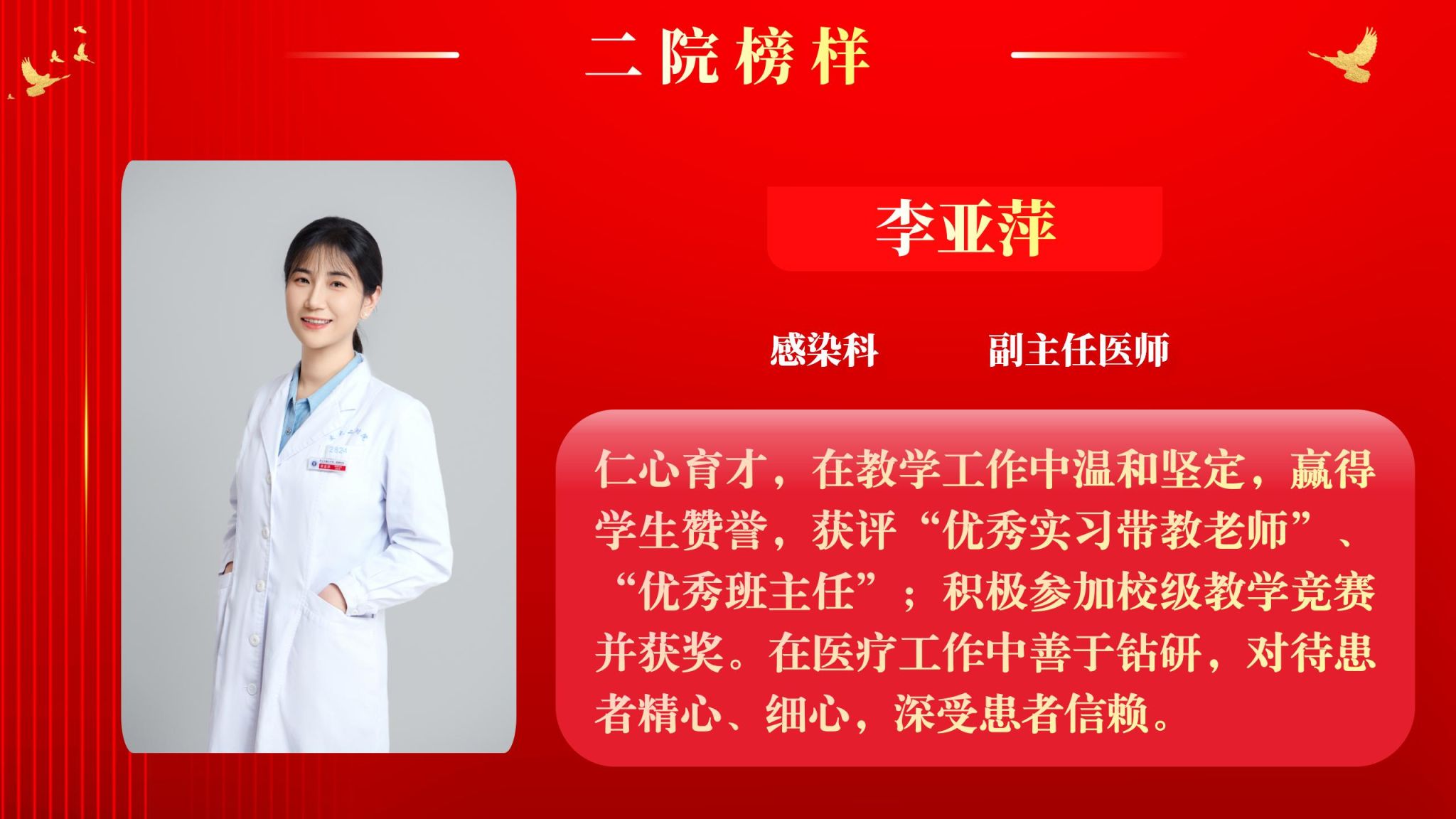 仰望星空有对标,脚踏实地有行动,平凡的是岗位,不凡的是精神。此次“二院榜样”月度人物共评选出10名,他们分别是:儿科住院医师王莉、耳鼻咽喉头颈外科病院主管护师吕晖、生物诊疗中心助理研究员朱鹏鹏、甲状腺外科住院医师乔浩、老年神经内科主管护师刘颖、感染科副主任医师李亚萍、全科医学科住院医师贾立斌、老年内分泌代谢/呼吸科住院医师常晓楠、妇产科住院医师梁诚、感染科副主任医师翟嵩。
