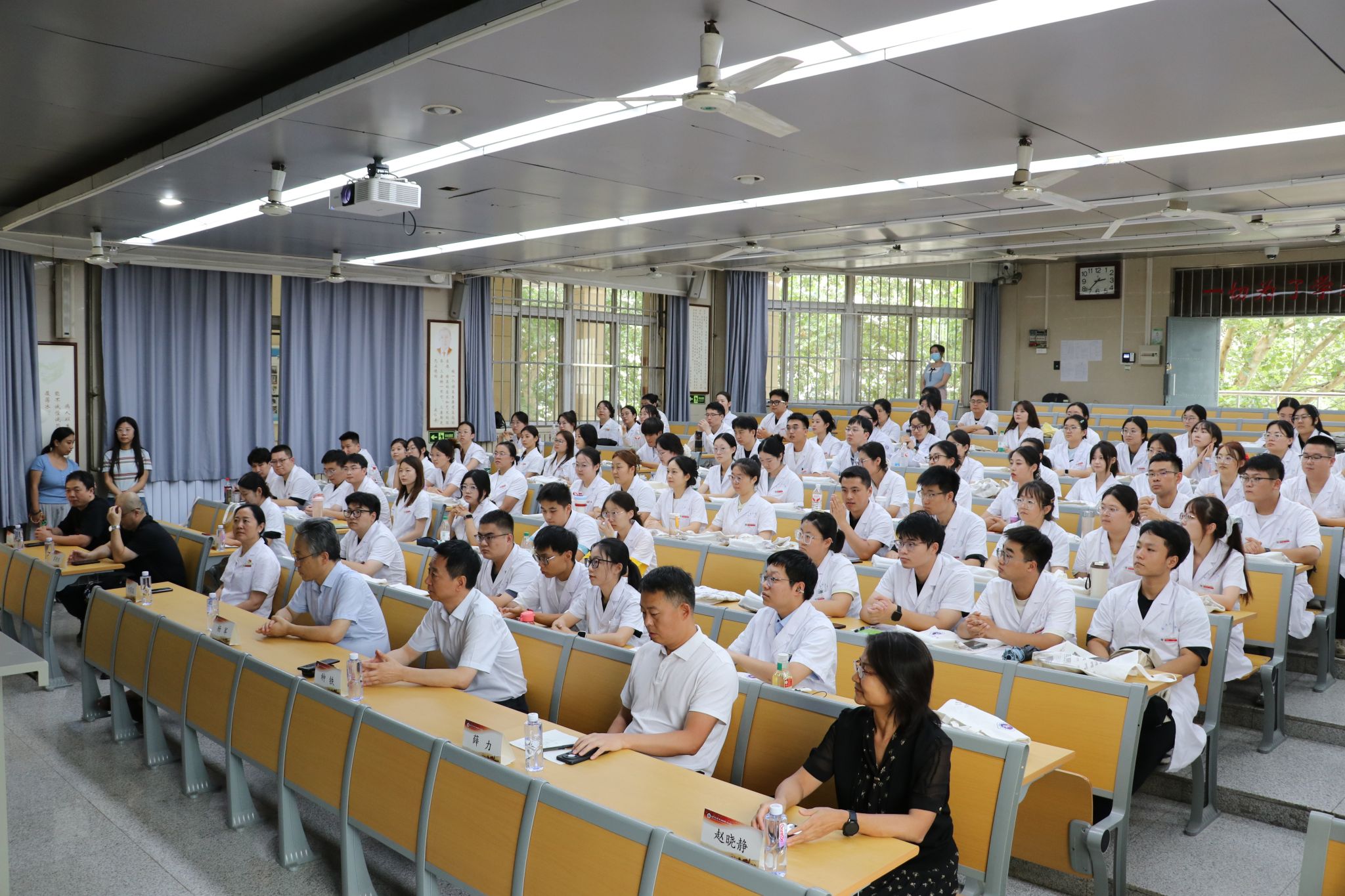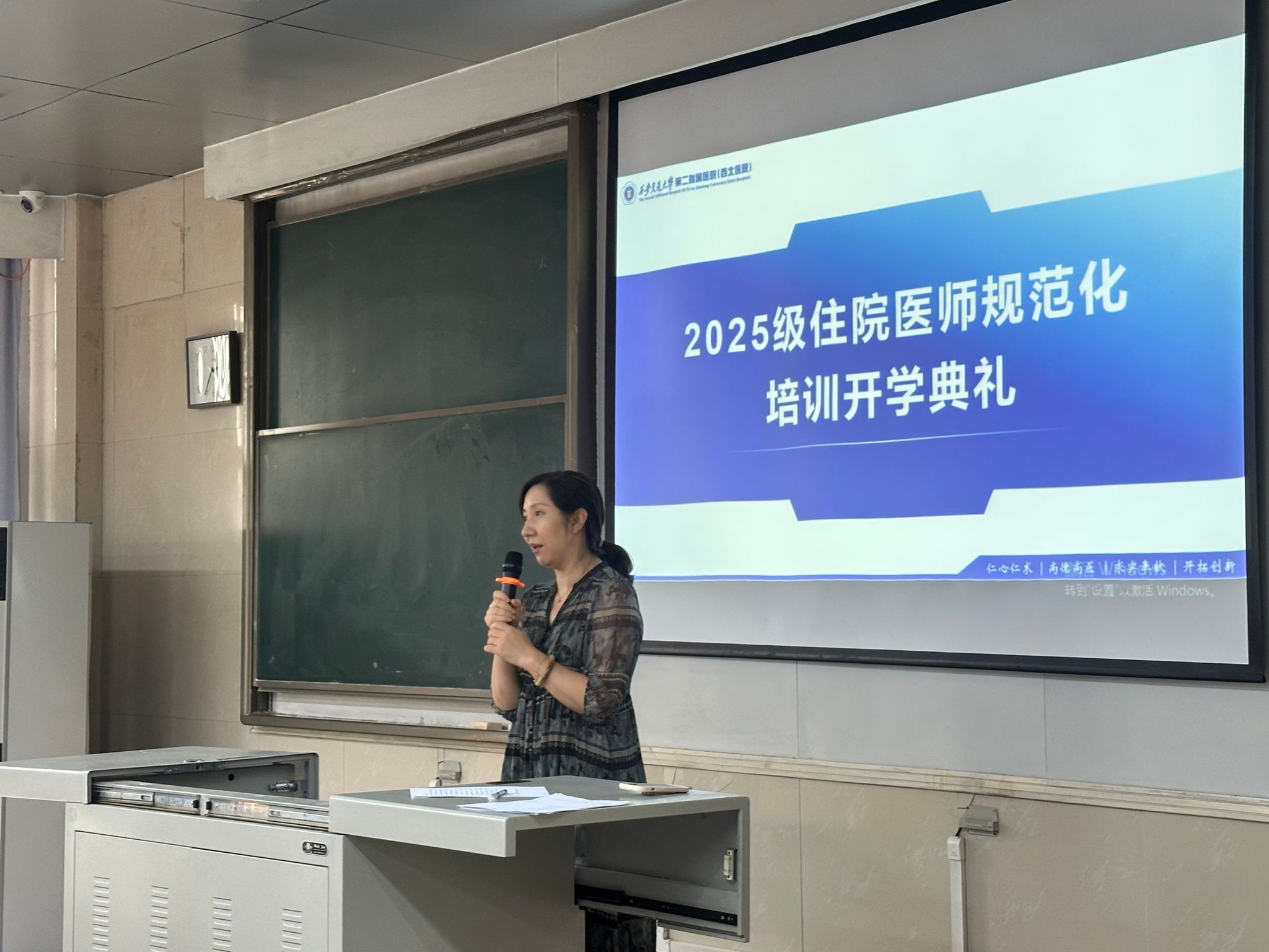 西安交通大学第二附属医院2025级住院/专科医师规范化培训(以下简称“住/专培”)开学典礼于8月25日下午14:30在第二教室举行。副院长种铁、内科专业基地主任付荣国、外科及泌尿外科专业基地主任薛力、临床病理科专业基地主任杨军、全科专业基地主任赵晓静、放射科专业基地主任张月浪、麻醉科专业基地教学主任雷晓鸣、临床技能实验教学示范中心副主任张澍,党政后勤科室代表及教务部管理人员、2025级全体住/专培医师参加此次开学典礼,典礼由教务部副主任刘颖主持。