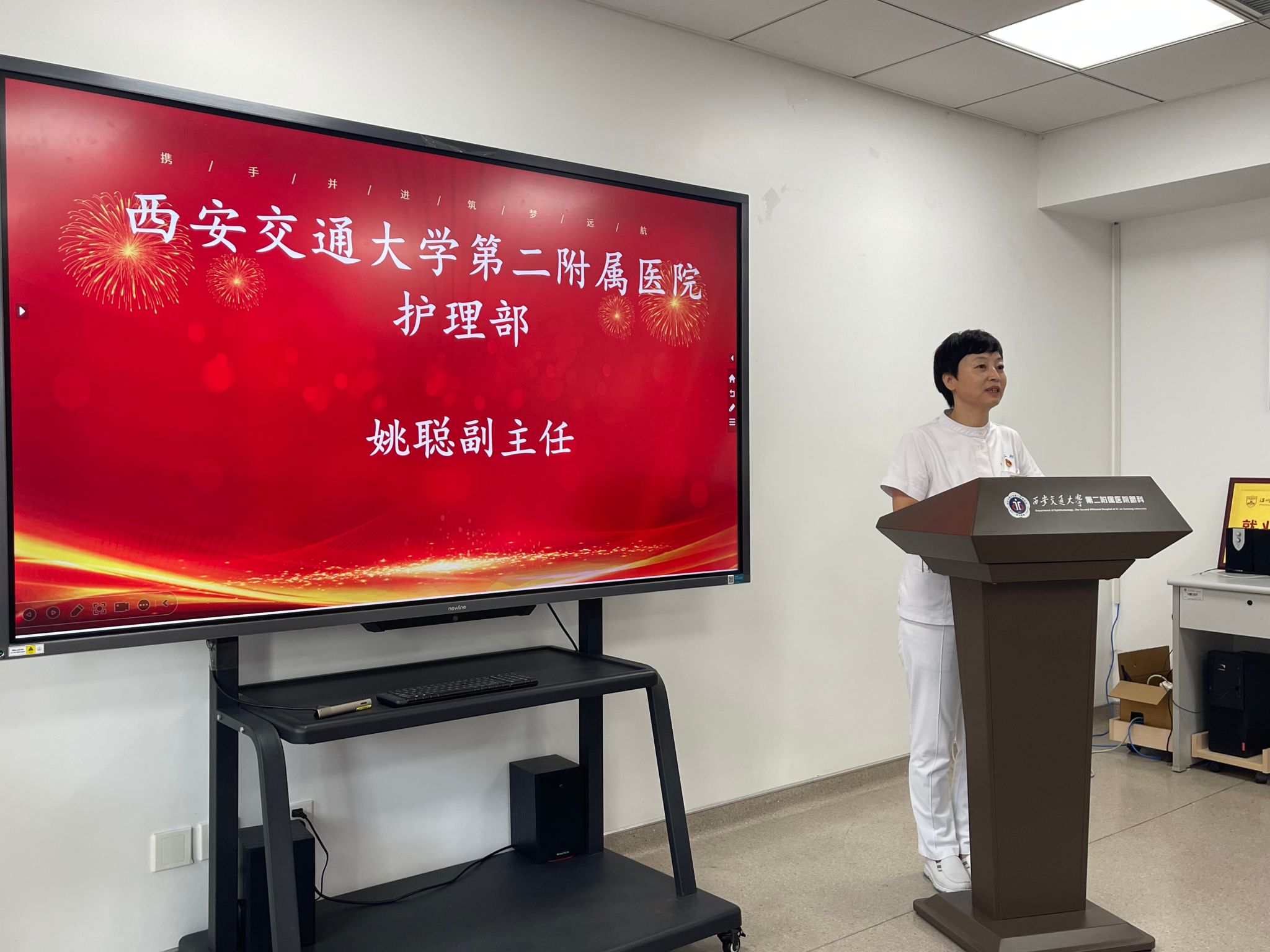 西安交通大学第二附属医院护理部姚聪副主任代表医院护理管理层面,为学员们搭建起医院护理体系与临床实践衔接的桥梁。姚聪副主任为学员们介绍了医院发展与现状,希望在接下来的实践中能学有所获,为患者的康复护理提供更优质的护理服务。