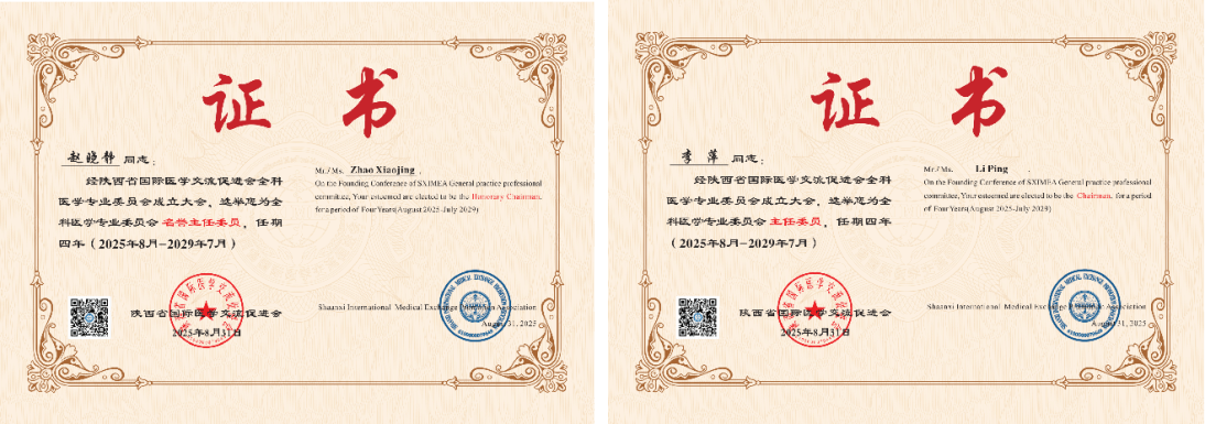2025年8月31日,由陕西省国际医学交流促进会主办、西安交通大学第二附属医院承办的陕西省医促会全科医学专委会成立大会暨2025年度学术研讨会在西安召开。会议上,我院全科医学科赵晓静教授任名誉主委,李萍教授任主任委员。
