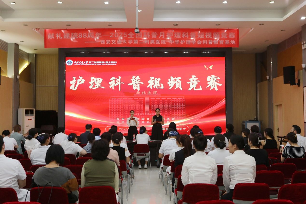 健康中国,科普先行。2025年9月4日,在全国科普月来临之际,护理部在南院区多功能厅成功举办决赛护理科普视频竞赛,为抗战迁陕88周年献上一份充满温情与专业的贺礼。作为中华护理学会科普教育基地,我院始终积极承担健康科普社会责任,推动护理科普创新发展。医院宣传部主任王妮、团委书记董艳,急诊科副主任张正良,科研副部主任马瑞、护理部副主任孔德玲、姚聪、陕西省护理学会科普专委会主委李领侠、总护士长杨长虹、王秀莹、杨会、王蓉及参赛团队100余人参加了竞赛。竞赛由门诊部主管护师李洁和王月主持。
