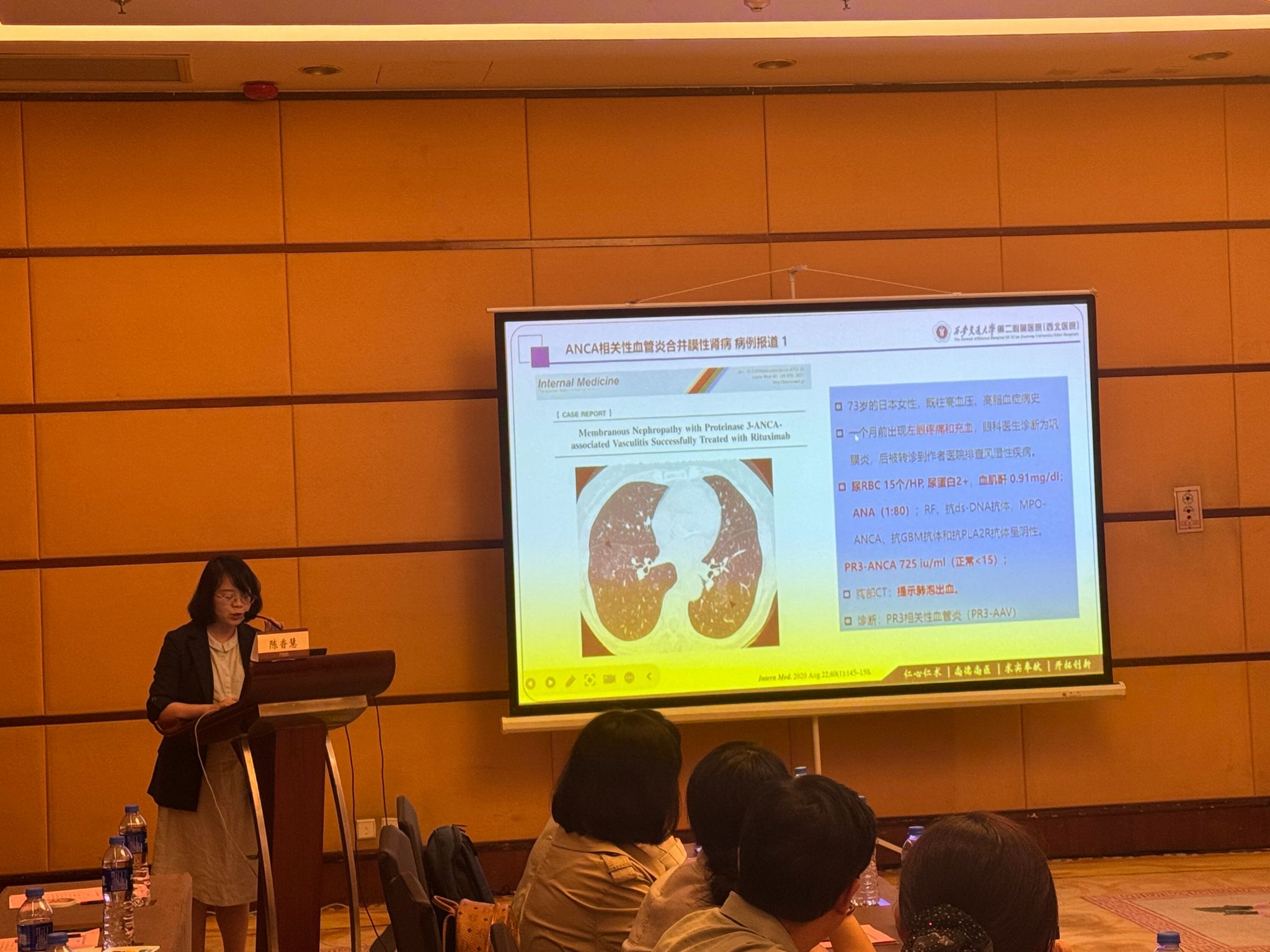 陈香慧医生与马晓桃医生分享了一例表现为肾病范围蛋白尿的ANCA相关性血管炎肾损害患者的诊治过程。这一病例引发了北京大学第一医院陈旻教授、西安市第九医院刘琼教授、陕西省中医医院于小勇教授和西安交通大学第二附属医院陈钊教授等专家的热烈讨论。