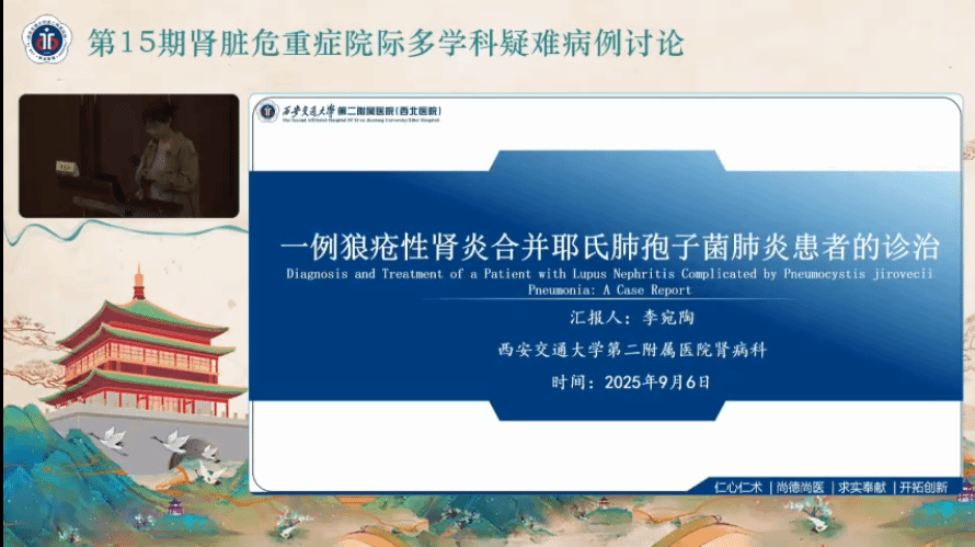 李宛陶医生介绍了一例狼疮肾炎合并肺孢子虫肺炎患者的诊治经验,西安市中心医院雷洁教授、西安市人民医院孟梅霞教授和西安济仁医院胡勇教授就此病例进行了多角度分析和讨论。