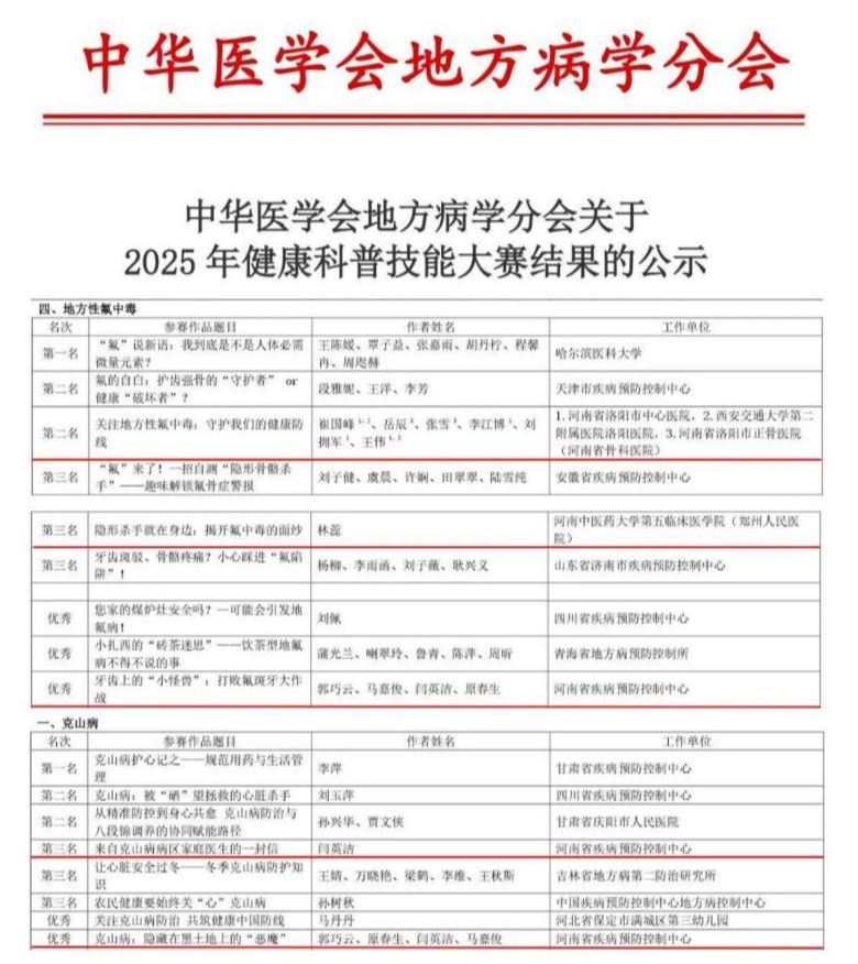 近日,在中华医学会地方病学分会举办的2025年健康科普文章大赛中,西安交通大学第二附属医院派驻至该院洛阳医院的执行院长、骨科中心主任王伟教授(洛阳市大骨节病专家组组长)担任指导,由洛阳医院骨科医师崔国峰(洛阳市地方性氟中毒防治组组长)作为第一作者、王伟教授作为通讯作者共同完成的科普作品《关注地方性氟中毒:守护我们的健康防线》,从251篇涵盖9个主题的参赛作品中脱颖而出,荣获地方性氟中毒主题二等奖。