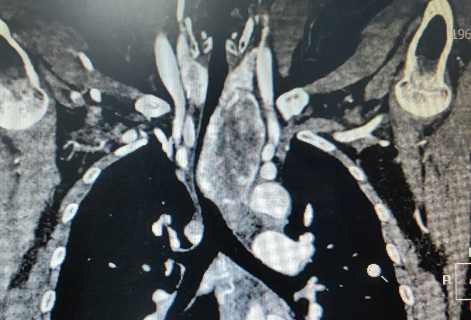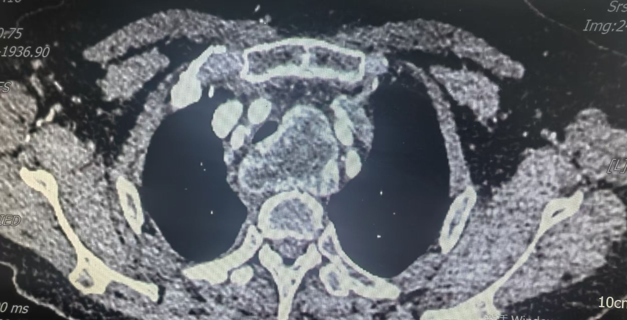 患者3 年前体检发现纵隔肿瘤,近期复查显示,上纵隔、甲状腺左侧叶后下方有一约 78mm×49mm×44mm 的团块状异常强化病灶,邻近气管、食管及主动脉弓分支受压移位,手术空间狭小且周围血管神经丰富,稍有不慎便可能造成严重并发症,对手术团队的技术和心理素质都是极大考验。