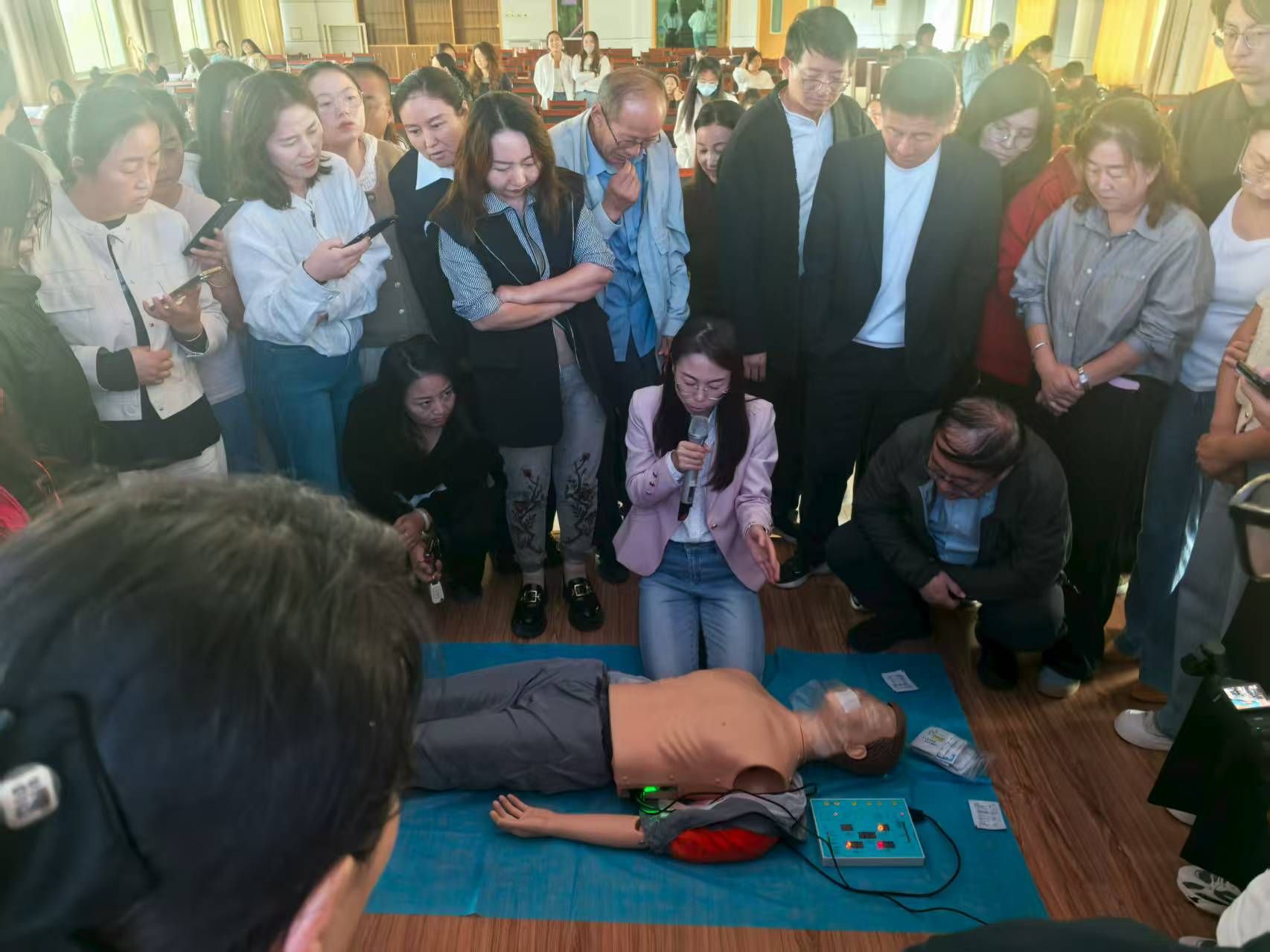 随后进行了心肺复苏的现场示教和模拟场景:有位病人突然晕倒,呼之不应、没有呼吸,你该怎么做?”一场“实战化”场景演练拉开帷幕。学员小张作为“急救者”,迅速评估环境安全,呼喊患者无反应后,立即让同事“拨打120、拿AED”,随后跪蹲在模拟人旁,逐渐规范完成30次胸外按压+ 2次人工呼吸,动作连贯流畅。“按压深度要够5-6厘米,手臂绷直用掌根部发力!”“按压的频率过慢,尽快提速。”“吹气的力度不够,胸廓没有起伏”。王志东、张小玲教授现场示范并指导学员们逐一规范完成心肺复苏流程,直至过程达标。“模拟心肺复苏看着简单,但操作起来要达标还有一定难度,要边操作边观察,还得注意力度、频率把控。”演练结束后,小张医生说到。