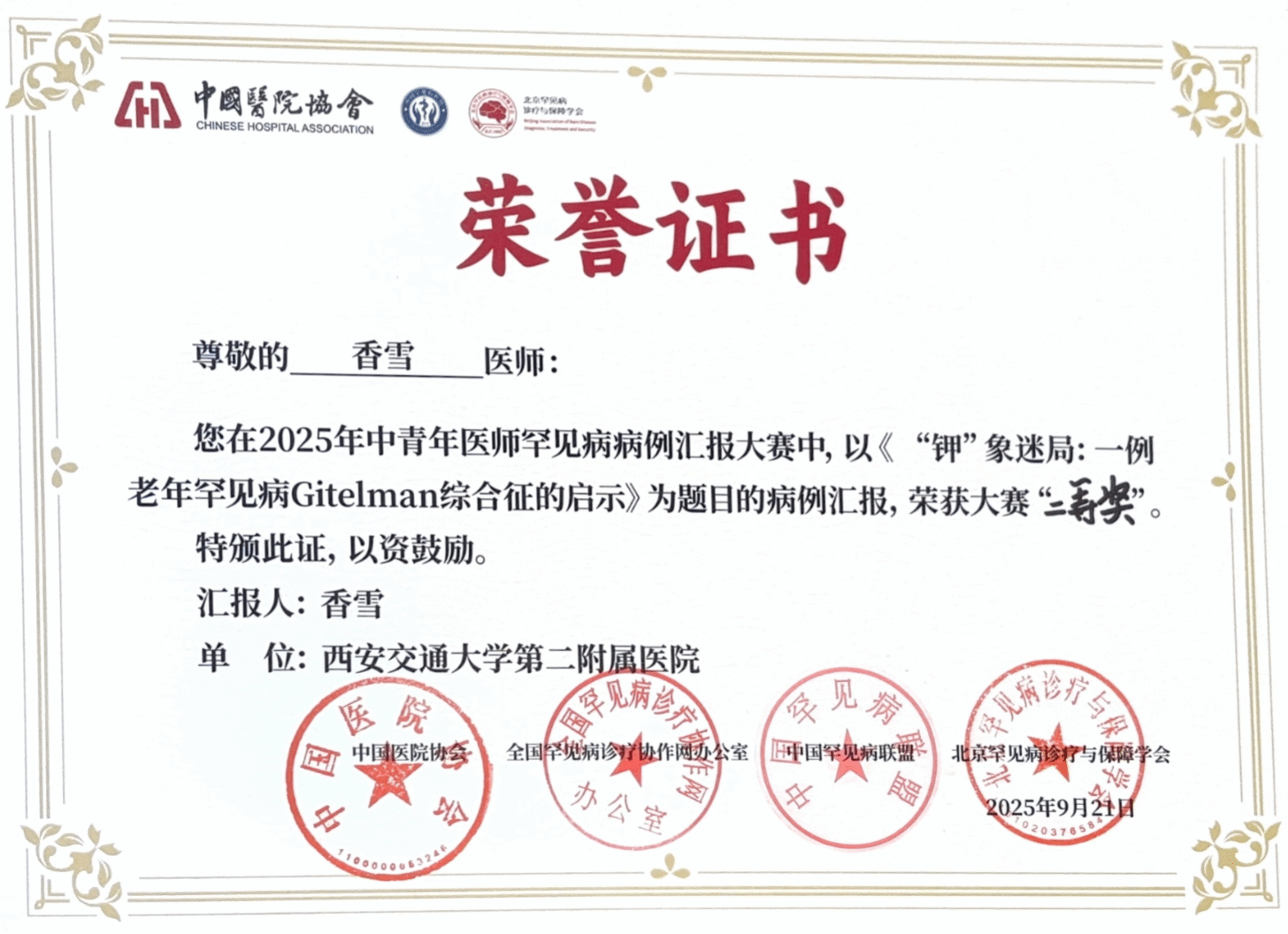 9月21日,在刚刚落幕的“2025年中青年医师罕见病病例汇报大赛”全国总决赛上,西安交通大学第二附属医院老年内分泌代谢科香雪医师凭借病例《“钾”象迷局:一例老年罕见病Gitelman综合征的启示》荣获全国二等奖。