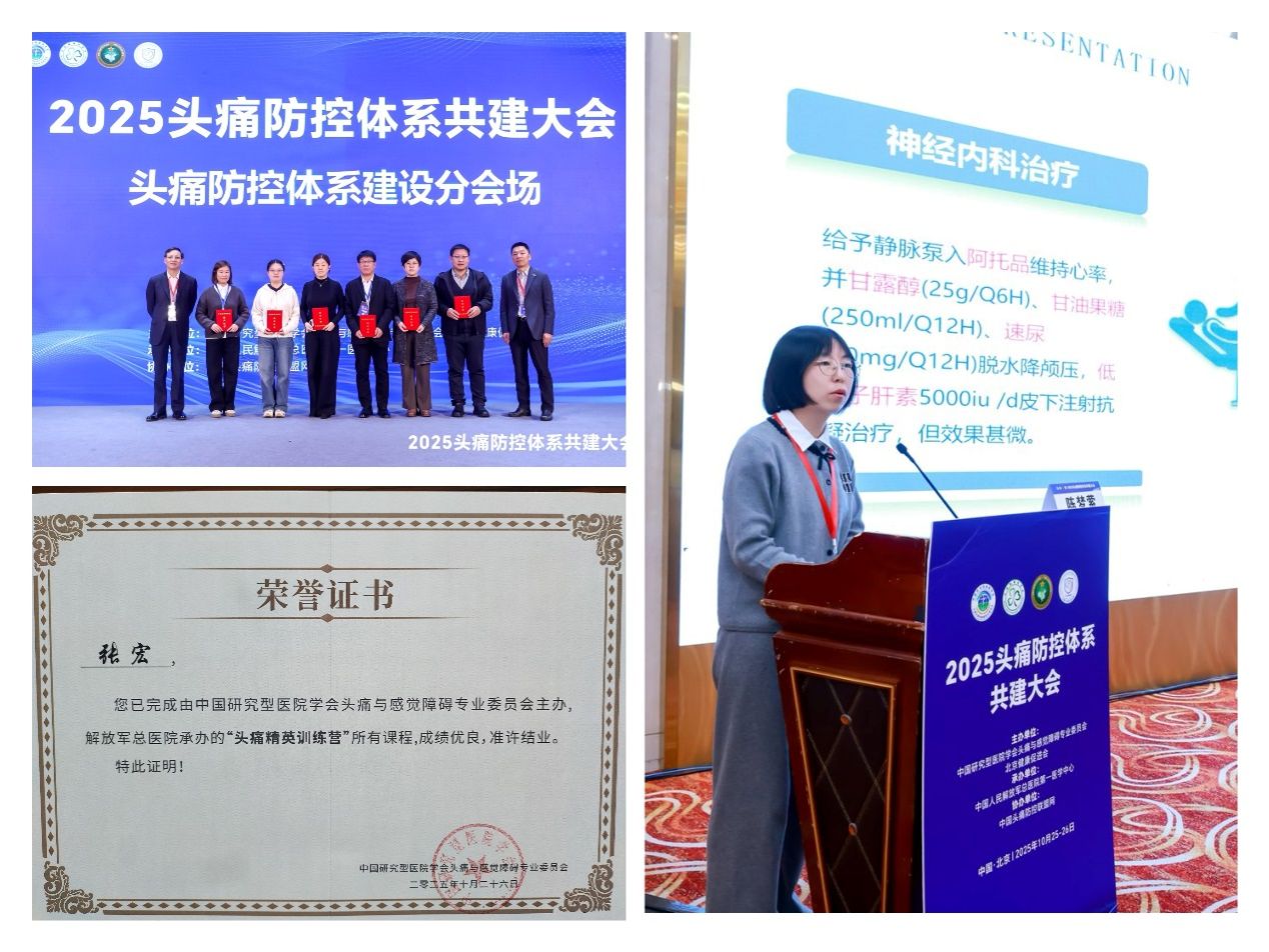 张宏医师参加了由中国研究型医院学会头痛与感觉障碍专委会主办、解放军总医院承办的“头痛精英训练营”,经考核合格后获颁荣誉证书。陈梦萦博士的研究报告从全国多篇投稿中脱颖而出,被大会主办方遴选为“头痛诊治前沿热点—个体化的患者管理”模块的大会发言,陈梦萦博士汇报演讲《分流管依赖综合征合并静脉窦狭窄》获得了与会专家的高度评价,也向国内外同行充分展示了我科头痛亚专业的诊治水平。