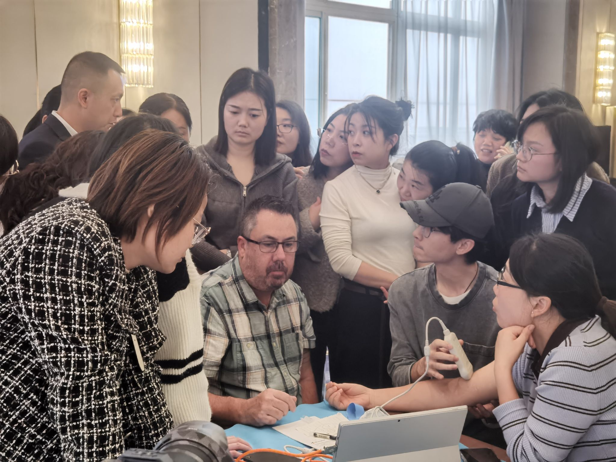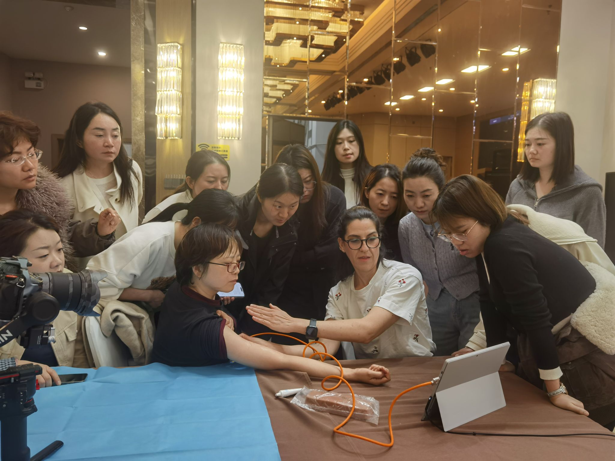 手执探头,匠心独运。次日,在B超引导下PICC置管与隧道式PICC置管的实操演示环节,Timothy R. Spencer教授与Gloria Ortiz Miluy教授进行现场演示,将理论转化为直观操作。学员在模型上进行实践练习,专家现场指导,有效提升了临床操作规范性和复杂情况处理能力。