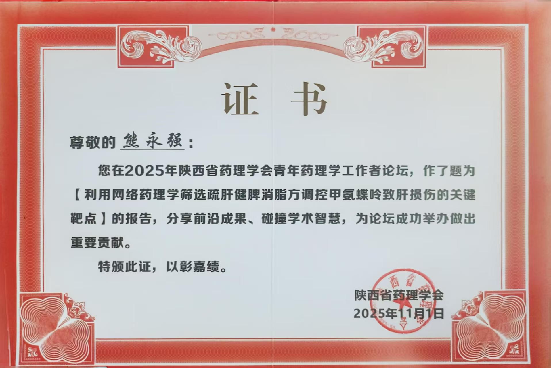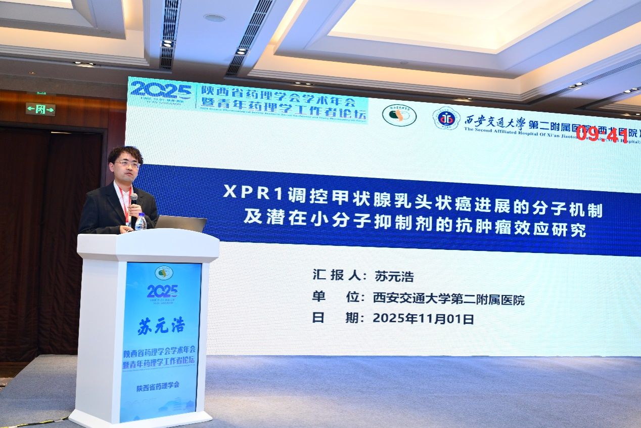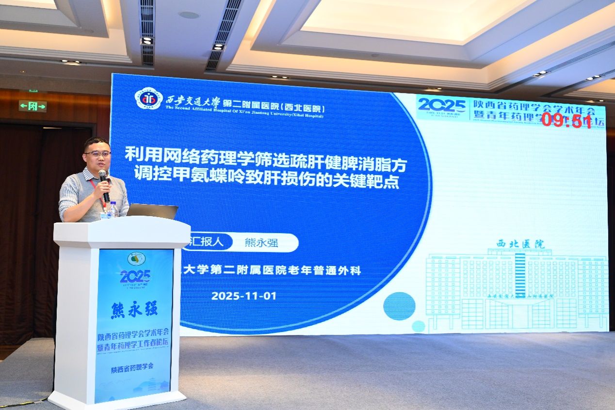 2025年11月1日,陕西省药理学会学术年会暨青年药理学工作者论坛在西安召开。在科室主任王志东主任的积极推动下我院老年普通外科踊跃投稿,科室熊永强医生、苏元浩博士生受邀在青年论坛进行报告,两位的研究工作同时得到陕西省药理学会老年病药物专业委员会姬媛媛主任委员的悉心指导。二人分别围绕抗甲状腺肿瘤药物干预机制与中药复方肝损伤调控领域做相关专题报告,展现了科室对临床与基础科研的深耕细作,以及对中西医结合诊疗模式的高度重视与积极探索。