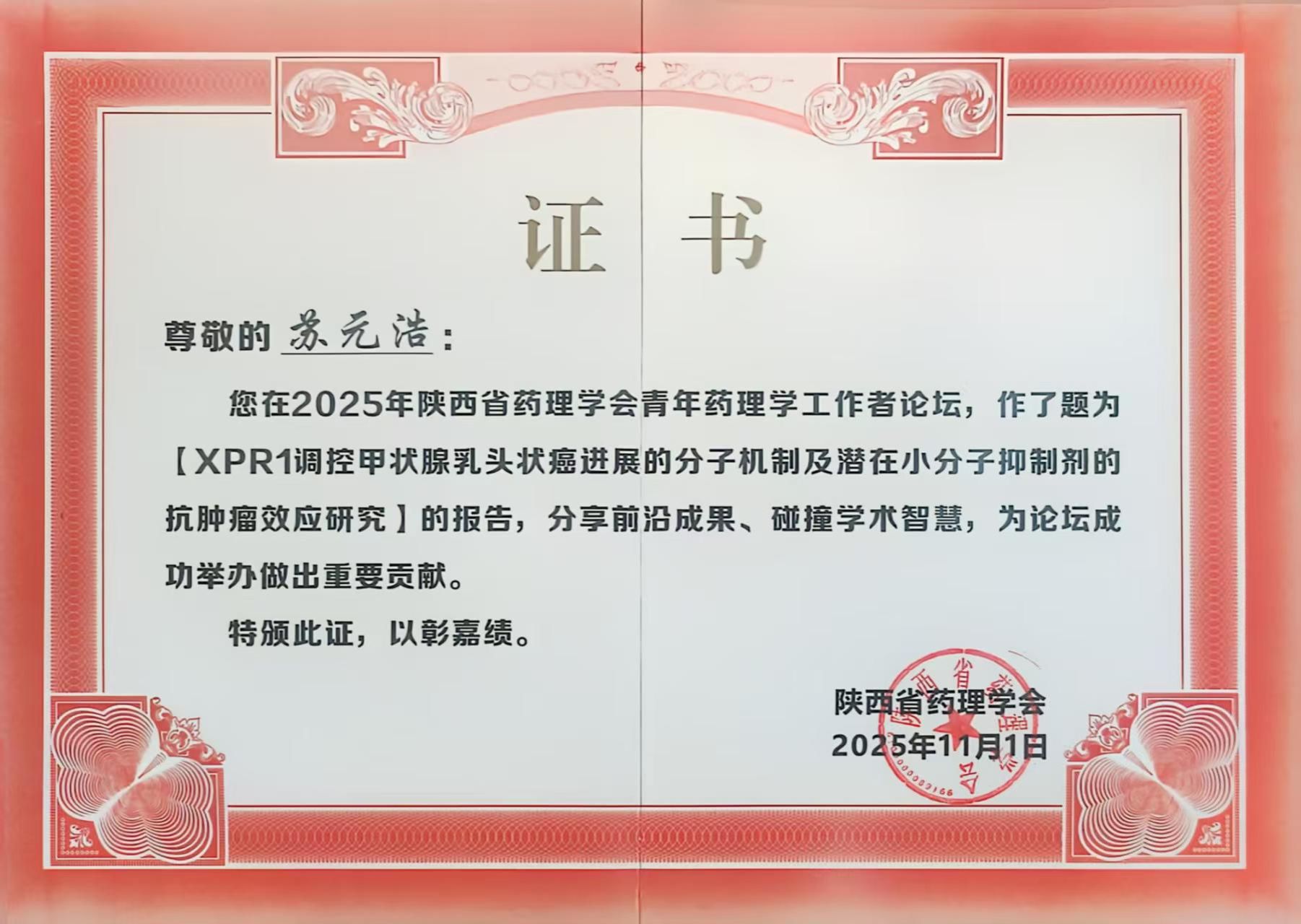 青年论坛汇报结束之后,与会专家给熊永强医生和苏元浩博士生颁发了证书,以彰嘉绩。此次陕西省药理学会学术年会的报告,是我院老年普通外科在肿瘤药理、中药研究领域的最新成果体现。