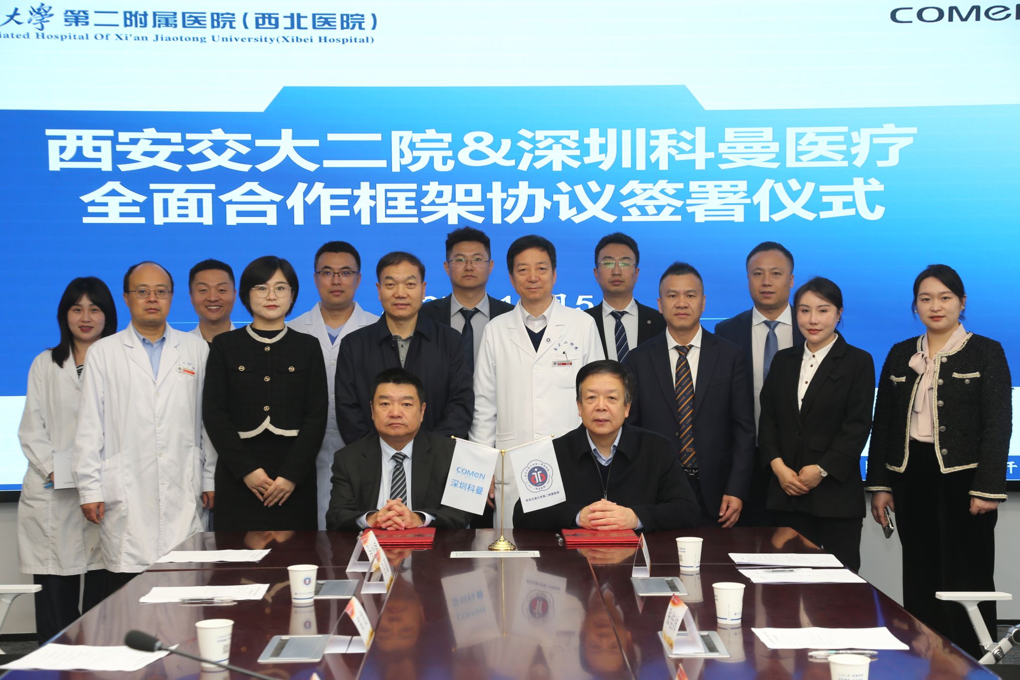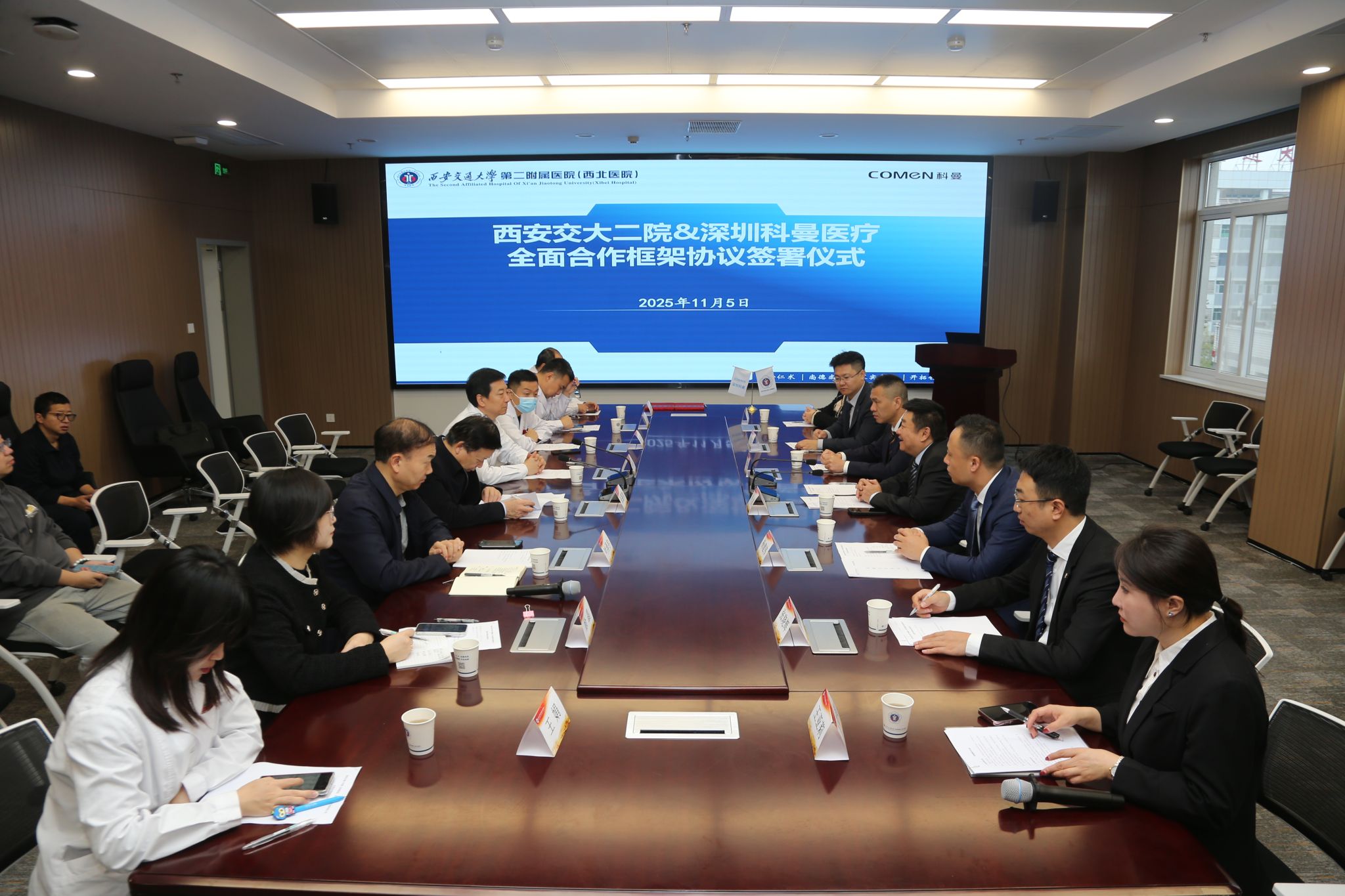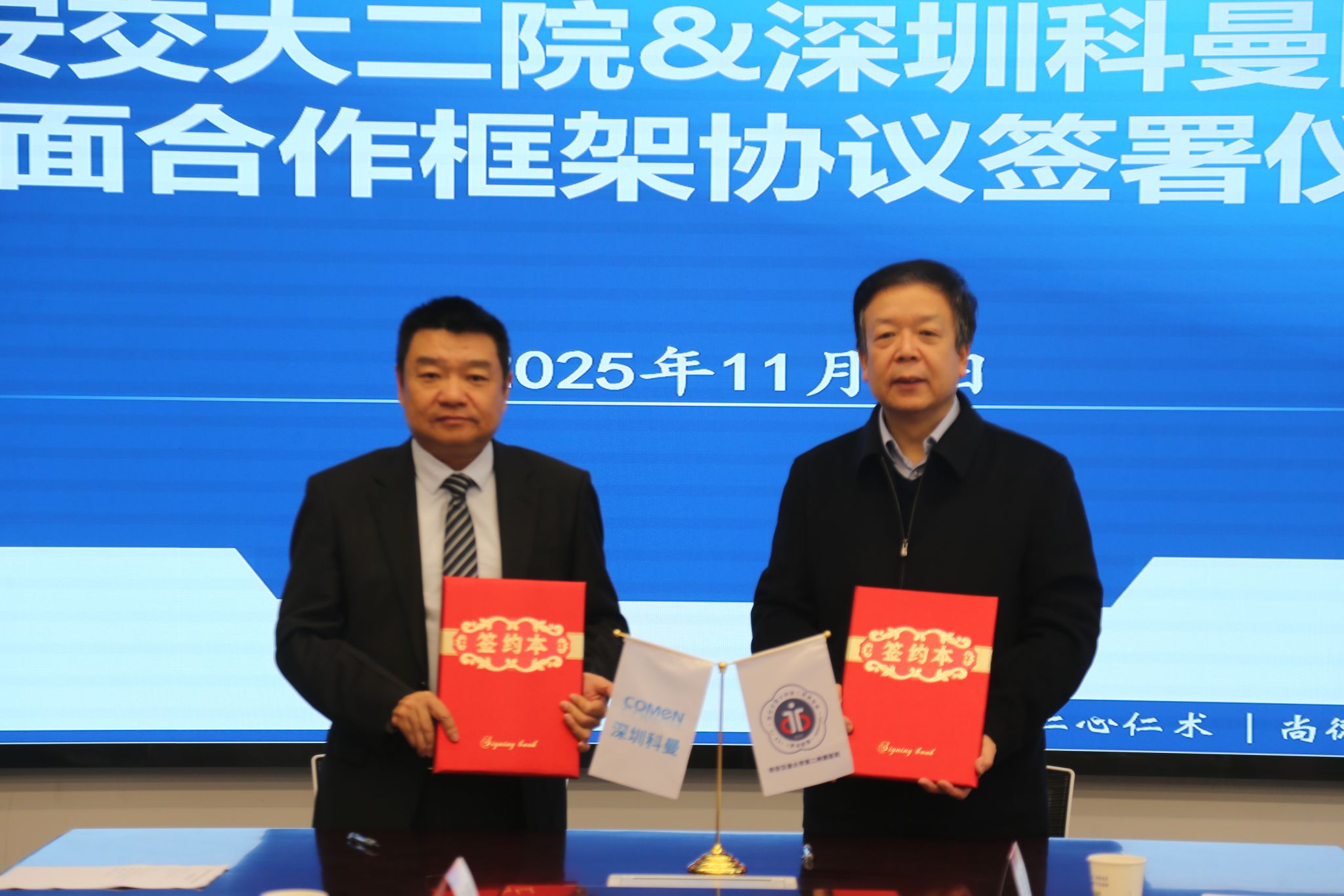 2025年11月5日上午,西安交通大学第二附属医院与深圳科曼医疗设备有限公司全面合作框架协议签署仪式在医院西三楼六楼会议室隆重举行。此次合作是医院深入贯彻落实西安交通大学党委书记卢建军来院调研指示精神、推动高质量发展的关键举措。医院党委书记刘昌对合作高度重视并给予悉心指导,院长张蓬勃、副院长种铁及相关科室负责人,与深圳科曼公司副董事长何波一行共同出席仪式。仪式由副院长种铁主持。