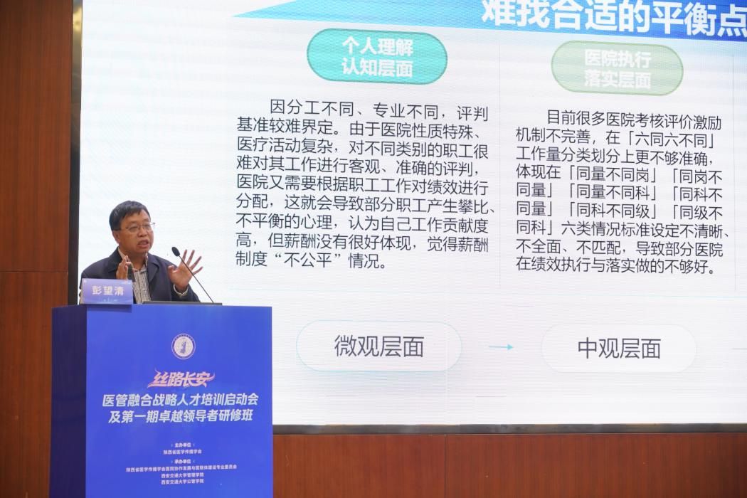 李宏杰会长首先致欢迎词,他表示学会将全力贯彻落实国家卫健委《关于医防管交叉复合型战略人才队伍建设发展的意见》精神,充分发挥学会的桥梁纽带和资源整合作用,以“丝路长安”培训项目为抓手,深入推进医管融合实践。他强调,学会将借力西安交通大学多学科平台优势,持续优化培训体系,努力为卫生健康事业培育更多优秀的复合型管理人才。