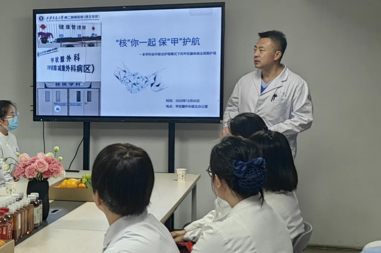 甲状腺作为人体最大的内分泌器官,有贮存、合成、分泌甲状腺激素的作用。甲状腺疾病近年来得到越来越多的人重视,针对甲状腺疾病的筛查,治疗,护理及预后,多学科联合团队共同进行学习交流。此次活动汇集甲状腺外科、核医学科及健康管理部相关科室主任及护理工作者,并邀请护理部姚聪主任莅临指导。