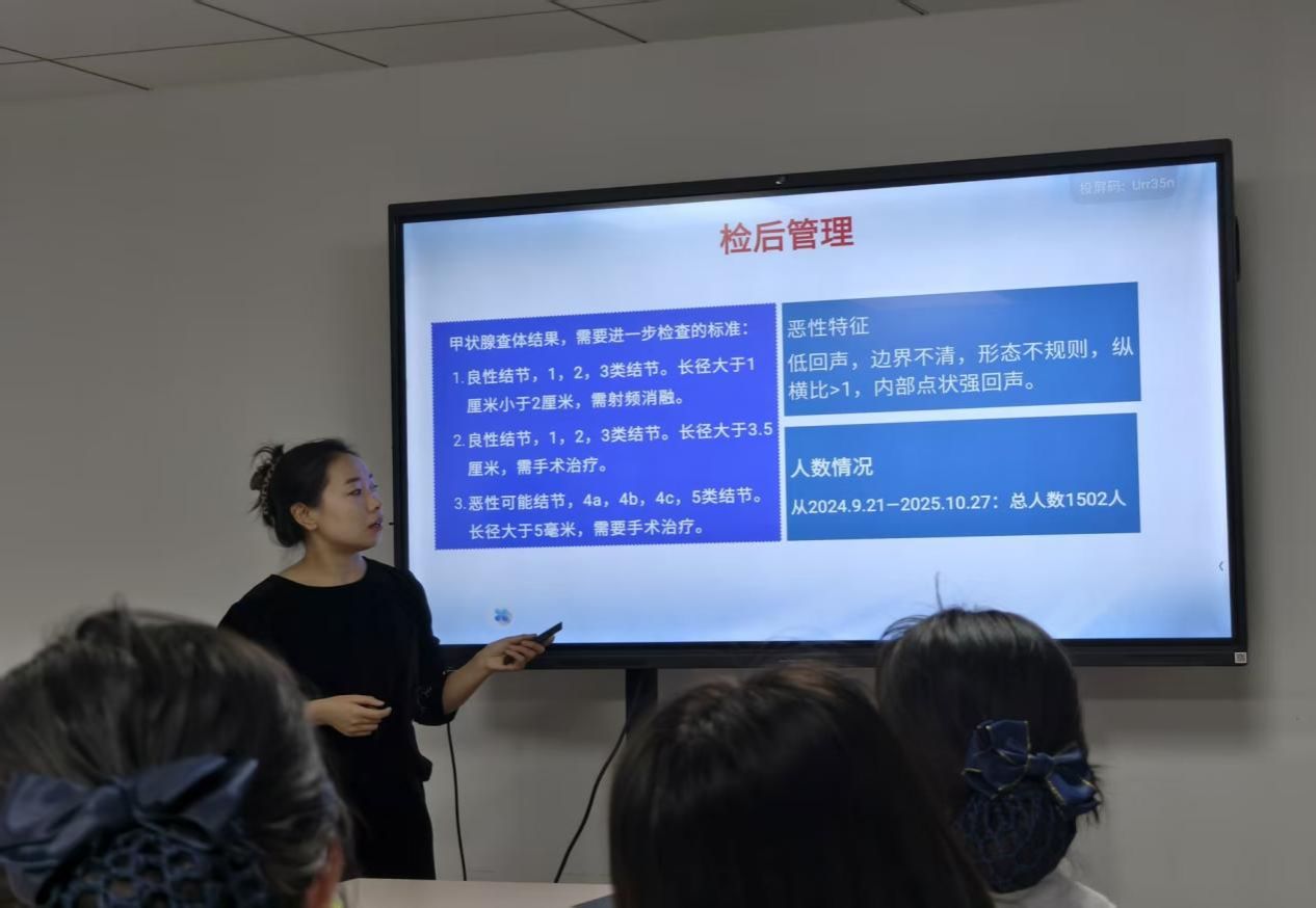 接下来由各个科室进行专业性知识分享,健康管理部樊亚菲护士通过甲状腺的生理解剖结构,讲解甲状腺的各类疾病,以及在B超引导下甲状腺结节分型,针对甲状腺疾病做出早期筛查。