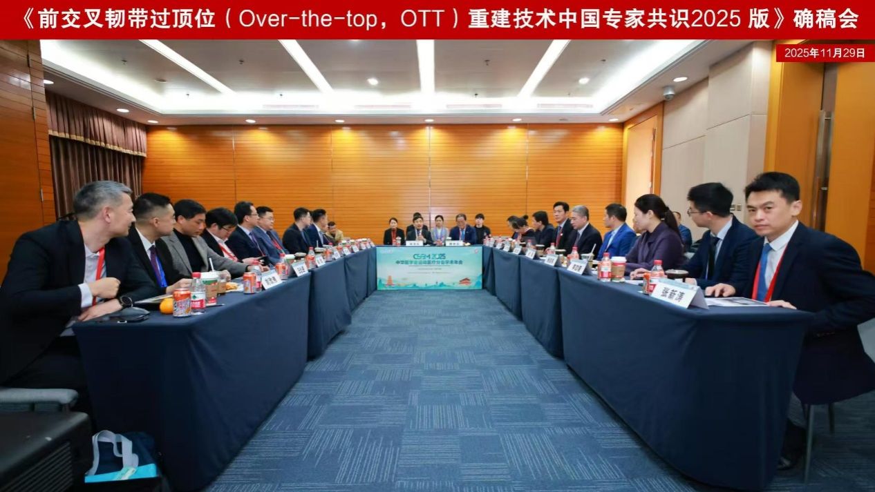 学术交流环节,科室专家聚焦临床关键问题与前沿方向,参与多项评审工作,分享多项重要成果。时志斌主任受邀担任《前交叉韧带过顶位(Over-the-top,OTT)重建技术中国专家共识2025版》专项评审专家。此项共识立足国内首个"前交叉韧带过顶位重建技术国际多中心循证研究",推动前交叉韧带重建领域朝"精准化"和"个体化"方向发展,对手术指征、技术要点和康复方案等进行了详尽规范,为临床实践提供更可靠的指导。时志斌主任同时在大会期间担任《巅峰时刻2025手术视频大展播》肩关节专场特邀嘉宾,对优秀手术视频进行全面、深入、专业的评估。