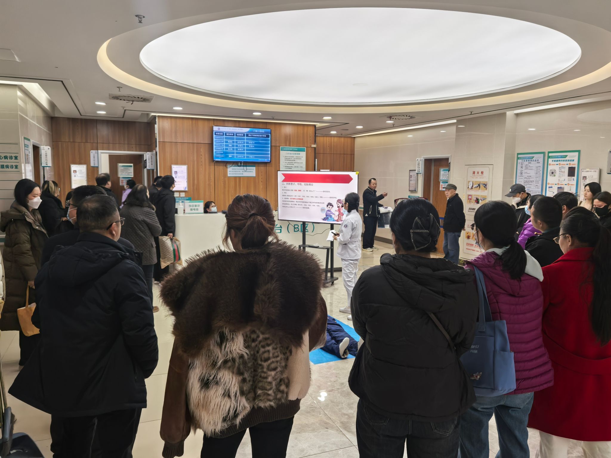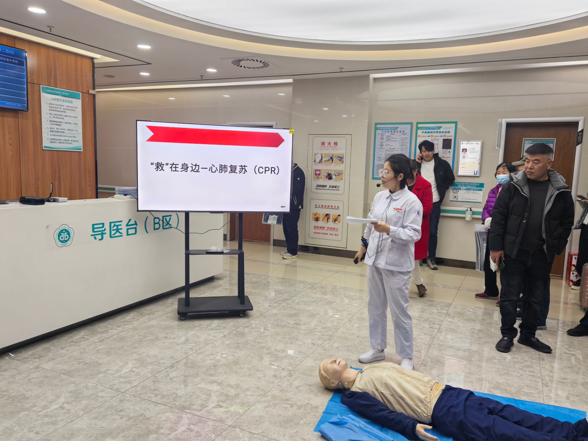 为增强公众急救意识,普及心肺复苏(CPR)知识与技能,12月8日上午,在大明宫院区门诊开展了一场以“心肺复苏,‘救’在身边”为主题的科普活动。本次活动由大明宫院区管理办公室的护士张艺瑞主讲。她用通俗易懂的语言,向现场患者系统讲解了心脏骤停的识别、心肺复苏术的重要性、黄金救援时间等关键理论。讲解过程中并特别强调了在专业医疗力量到达前,第一目击者实施及时、正确心肺复苏对于挽救生命的决定性作用。