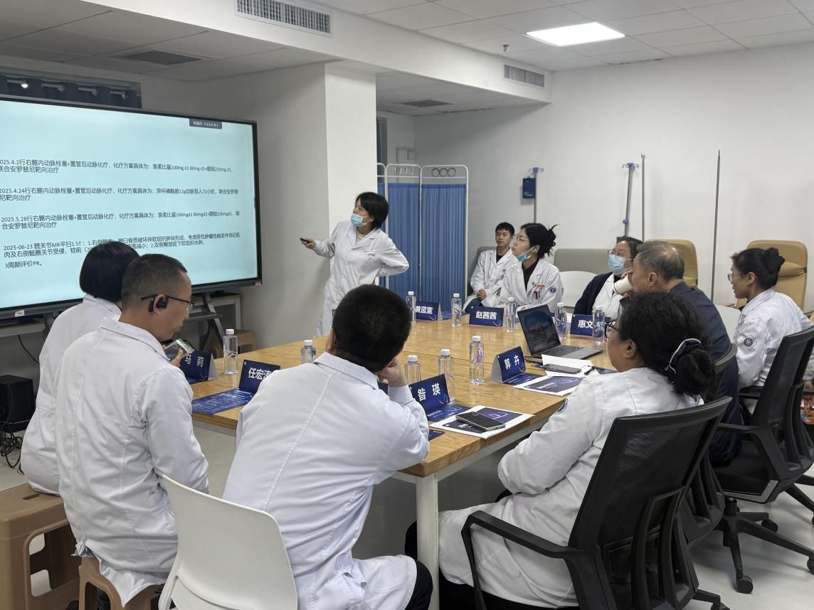 我院骨与软组织肿瘤多学科诊疗(MDT)团队核心骨干成员齐聚一堂,开展了热烈而深入的研讨。团队成员包括肿瘤内科昝瑛副主任医师、宋玲琴主任医师、惠文涛副主任医师,放疗科任红宏涛副主任医师、赵茜茜副主任医师,核医学科屈伟主任,病理科马莉主任医师,影像科晋瑞副主任医师,以及各相关科室的学科带头人与青年医师。现场学术氛围浓厚,讨论气氛热烈。王臻教授聚焦四例罕见且典型的软组织肉瘤病例,以其独特的视角和详实的案例资料展开逐案剖析。他从患者病史采集、影像学特征分析、病理分型确诊到治疗方案制定,对诊疗全流程进行了系统性复盘。结合NCCN与CSCO最新指南内容,王教授深入探讨了软组织肉瘤的治疗策略选择与前沿研究进展,不仅为罕见病例的个体化诊疗梳理了清晰思路,也为临床应对此类罕见肿瘤的诊疗难题积累了宝贵经验。