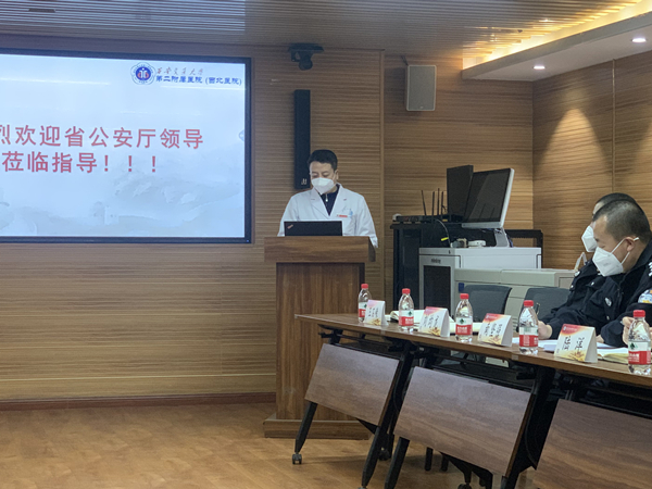 李小鹏副院长从医院历史沿革、人才梯队建设、学科建设、近几年医教研发展成果和社会服务几个方面向工作组全面介绍了医院现状和发展成果,接下来从医院安保组织体系建设、保卫队伍建设、制度建设、三防建设、警务室建设、医警联动等几个方面详细讲解了医院“平安医院”建设工作开展情况和取得成果。李小鹏强调,二附院身处市中心特殊位置,除了面对4000多职工和广大病患,还有交大近千名在校学生,较为复杂的周边环境和治安状况不可谓压力不小。医院各项医教研工作平稳有序开展,离不开学校和医院领导班子的大力支持和正确领导,也离不开医院各职能部门通力合作和辛勤耕耘,更离不开各级公安机关对医院的大力支持和帮扶。