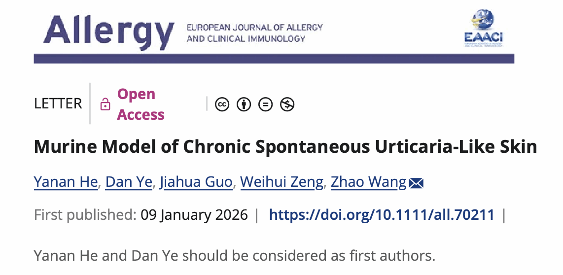 2026年1月,团队在国际知名期刊《Allergy》发表research letter(题为“Murine Model of Chronic Spontaneous Urticaria‐Like Skin”),针对慢性自发性荨麻疹(CSU)机制研究缺乏公认动物模型的核心瓶颈,成功构建可模拟疾病关键特征的小鼠模型,为解析CSU发病机制、研发靶向疗法提供了重要实验工具。何亚男硕士研究生及叶丹博士研究生为共同第一作者。