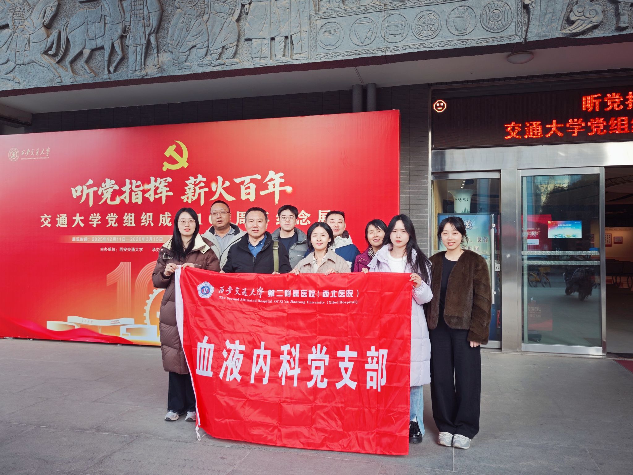 为深入学习贯彻党的精神,加强党员理想信念教育,2026年1月9日下午,西安交通大学第二附属医院血液内科党支部组织部分党员前往交大兴庆校区博物馆,参观“听党指挥 薪火百年——交通大学党组织成立100周年纪念展”,开展了一次深刻而生动的主题党日活动。