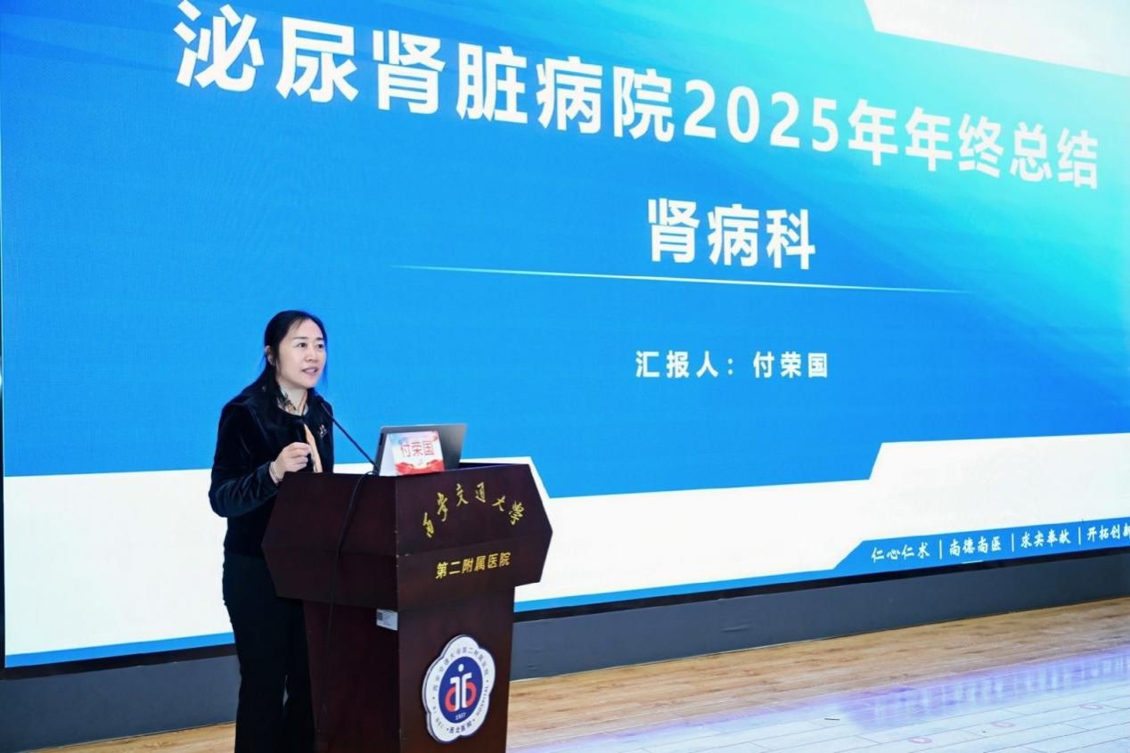 随后,付荣国主任代表肾内科做年度工作总结。他从临床诊疗、科研项目、教学成果及质量安全四个维度展开,系统回顾了肾内科在2025年开展的新技术、完成的重点课题,并针对慢性肾脏病管理、血液透析质量提升等核心工作提出了2026年的优化方向,明确了以患者为中心、以技术为支撑的发展思路。