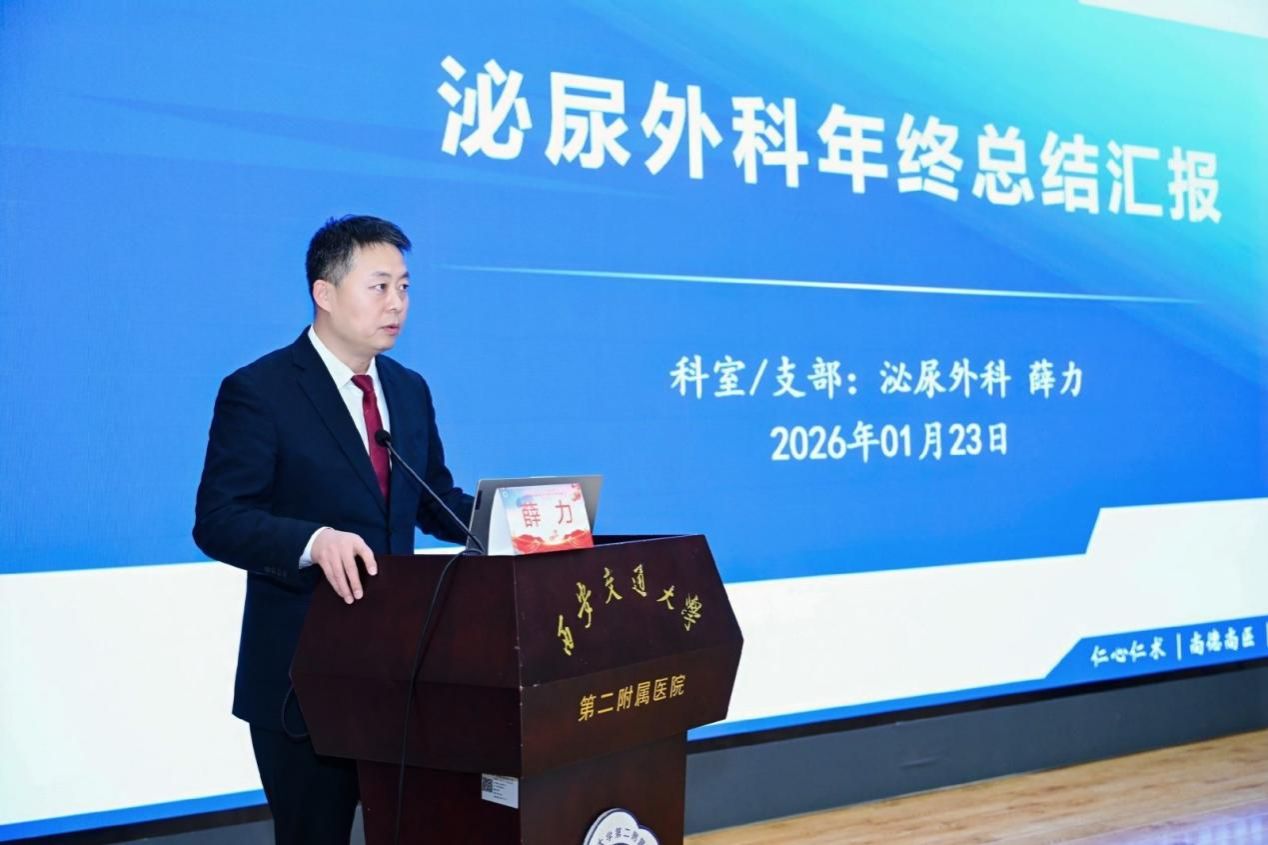 薛力主任代表泌尿外科汇报了年度整体工作。他重点梳理了泌尿外科在微创手术创新、泌尿肿瘤精准诊疗、泌尿结石规范化防治等领域的进展,分享了科室在国家级科研项目立项、学术论文发表及专科影响力提升上的成果,并提出未来将进一步深化亚专业建设、加强多学科协作,持续提升区域诊疗辐射能力。