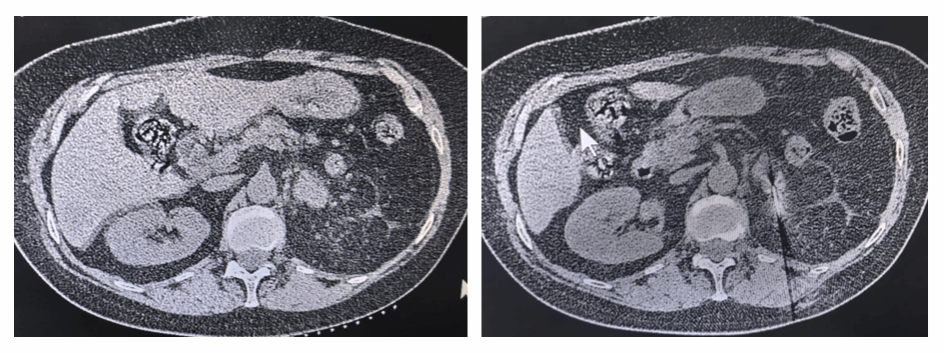 患者为73岁女性,2024年确诊阴道低分化鳞状细胞癌伴全身多发专业,经多线化疗、免疫、靶向、放疗后,全身病情控制理想,仅左侧肾上腺转移瘤持续增大压迫周围组织引发腰背部胀痛,面对患者复杂的病情,肿瘤内科迅速组建多学科诊疗(MDT)专班,考虑到患者病情与肾上腺器官特殊性,全身治疗后续治疗方案疗效有限,放疗耗时长,冷热消融术可以克服激素释放且对周围正常脏器损伤低,经多学科讨论后实施我院第一例肾上腺转移瘤冷热消融术。