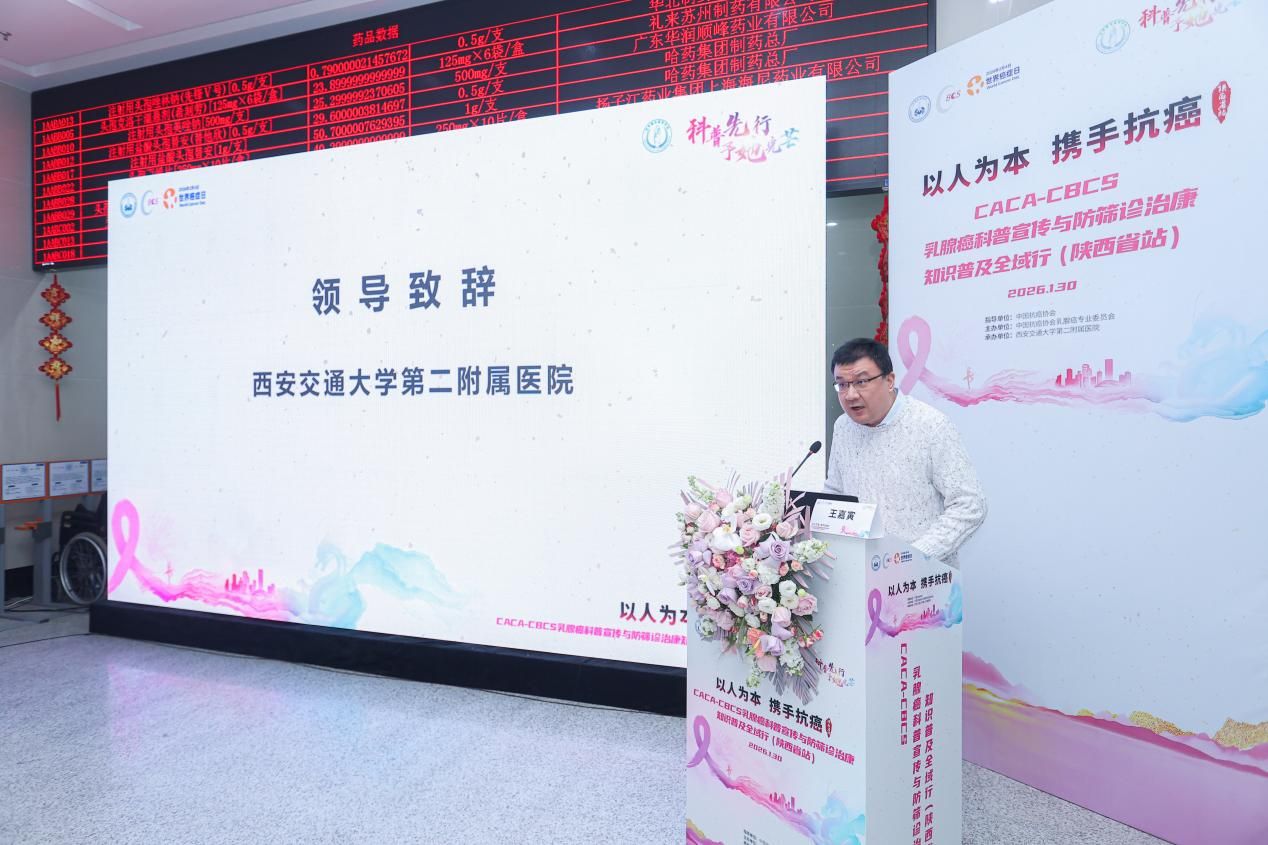 2026年1月30日上午,由中国抗癌协会、中国抗癌协会乳腺癌专业委员会(CACA-CBCS)主办的、西安交通大学第二附属医院承办的“循象问道 和合共生 ——2025CACA 乳腺癌科普全域行(西安站)暨 CACA-CBCS 乳腺癌科普宣传与防筛诊治康知识普及全域行”活动在西安成功举行。本次活动旨在提升公众对乳腺癌防治知识的认知,加强医患沟通,推动乳腺癌早筛、早诊、早治理念的普及,为女性构筑起一道坚实的健康防线。活动在西安交通大学第二附属医院大明宫院区举行,吸引了众多医护人员、患者及家属参与。