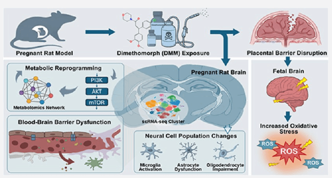 近日,西安交通大学第二附属医院妇产科张婷婷教授团队在环境科学与健康领域国际顶级期刊《环境科学与技术》(Environmental Science & Technology,影响因子11.4)上发表题为“Single-Cell Dissection of Dimethomorph-Induced Neurotoxicity in the Gestational Brain: Metabolic Disruption and Blood-Brain Barrier Dysfunction”的研究论文。该研究首次从单细胞水平系统揭示了常用杀菌剂烯酰吗啉(Dimethomorph, DMM)在孕期暴露中对胎儿大脑发育的潜在风险及其作用机制,为农药安全评估与神经保护策略提供了重要科学依据。