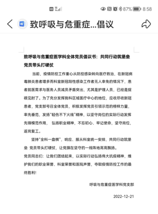 在科室90%以上人员感染的情况下,党支部号召全体党员,积极发挥党员引领示范的榜样力量,一个人倒下,一支队伍顶上去。杨拴盈主任操着沙哑的嗓子指挥着,张洁党支部书记不顾自己仍有低热,带领5个刚“阳”了3天,体温才恢复正常的年轻一线大夫坚持在一线;单虎医生坚持工作1周都没有回过家,他说:“我在这里多工作一天就能让生病的同事多休息一天”;柯蕊医生忍着剧烈咳嗽,1天之内收入院20余位患者;葛娟医生舍下家中嗷嗷待哺的孩子,拖着发热的身躯顶在一线,给病人做心电图,抽血气,放弃休息时间带班;胡露大夫孩子高热40度发生抽搐,她急得眼泪直流,赶回家处理完孩子的病情又来病区工作了;主管ICU病房的科室副主任方萍教授,一个月来没有休息一天,她说:“现在是关键时刻,危重病人多,我们呼吸ICU就是收治重症病人的地方,我在病房,年轻人就有主心骨了”。在她的带领下,ICU原有床位全部收满,同时又将12张普通床位转化成重症床位,30张重症床位满负荷运转。还有住院总医生宁璞和王煜,几乎24小时连轴转,在全院各科室和急诊科会诊,在病区解决新冠感染病人的诊治和收治,压力如山倒,他们偷偷抹掉眼泪继续用微笑面对患者;还有科室的护士姐妹,在护士长周淑如、刘艳琴、胡佚凡、刘丽萍的带领下,个个“轻伤不下火线”,没有一个不是“阳”着来上班的,只要科室需要,没有一个说“不”的。曾参与“援鄂”的阎京京,连日来加班加点,在ICU贡献着抗疫救治危重患者的经验。