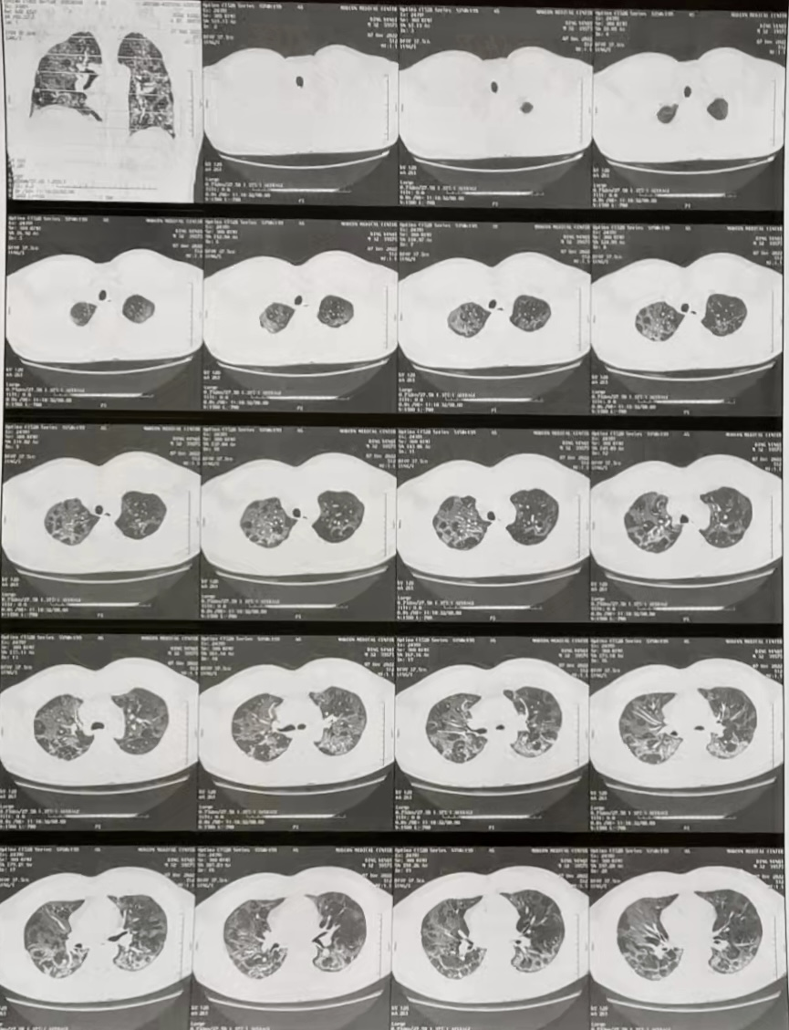 三人赶赴华夏医院后,在进一步向医院内科张锦玉主任和张友忠院长了解病情后,全副武装(着防护服、护目镜、N95口罩、外科手套、口罩、帽子和鞋套等),前往病房查看患者状况。刘重霄教授、杨屹教授和刘海教授通过询问病史,体格检查,并综合检查单,用药情况以及前后三次胸部CT(双肺多发不规则磨玻璃影,病灶增多并融合,呈进展趋势)和颅脑CT表现,严密分析病情,展开治疗方案讨论,尤其是综合前期两位国内专家的意见,从多脏器系统的功能维护、纠正水电解质失衡、加强营养支持、合理使用抗生素等多个方面提出建议。同时,考虑到患者来非洲仅2月,远离亲人,心理压力较大,也尽量从语言上安慰,减少患者紧张和焦虑情绪。