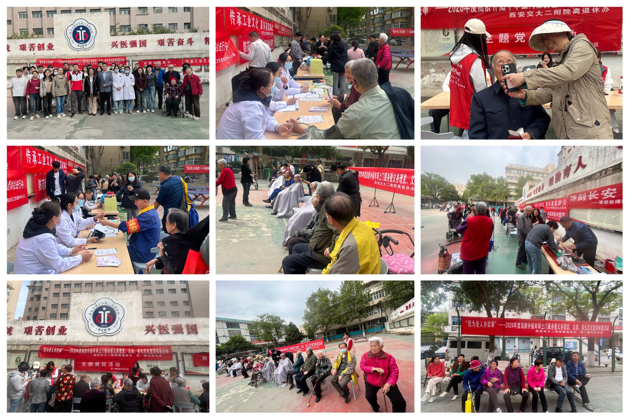 暖心助老践初心,便民服务润桑榆。为了方便离退休老人及家属,4月10日,我院离退休办联合新城区兴乐社区,在南院家属区开展“我为老人办实事”-2026年高龄补贴复审暨义务理发、义诊、反诈宣传、多元文化宣讲体验活动,当天共为离退休老人及家属完成高龄补贴复审100余人,入户复审5人次,义务理发50余人,多元文化体验50余人。将贴心服务送到家门口,为高龄老人和行动不便的离退休老人提供了便利,用实际行动守护老年群体的幸福晚年,受到离退休职工、家属及保姆普遍赞扬。