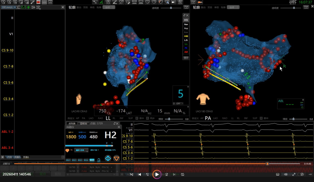 经验分享后,刘晓霞教授走进导管室,以其精湛的手术操作,为全体学员演示了房颤脉冲消融国际最前沿的“2C3L手术策略”。她精准且高效地实现了双肺静脉、二尖瓣峡线、三尖瓣峡线、后壁线、上腔静脉等部位的精准阻滞,充分展现了脉冲电场消融技术在关键解剖部位消融中的卓越效率与安全性。