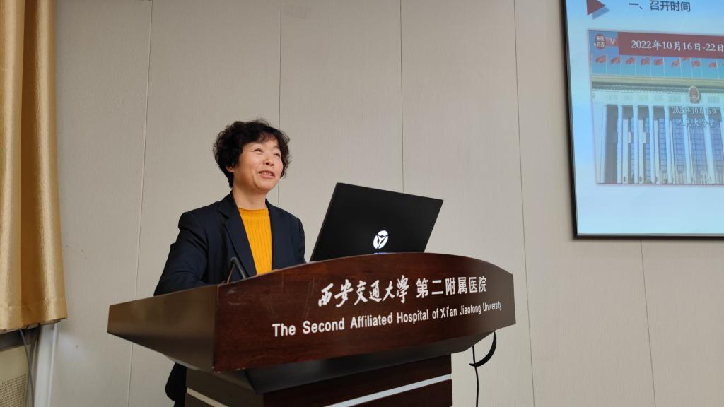 在集体学习环节,党变玲作题为《党的二十大精神 激扬青春志》的讲课,她从党的二十大概况、二十大报告对青年的期待、二十大报告的健康蓝图擘画、新时代青年医者的使命任务为与会人员进行了详细讲解。她从党的二十大召开的时间、大会主题、主要议程等十个方面进行解读,与会人员认真学习了党的二十大精神。她讲到,习近平总书记提到“青年强,则国家强。当代中国青年生逢其时,施展才干的舞台无比广阔,实现梦想的前景无比光明。”她勉励与会人员,要做有理想、敢担当、能吃苦、肯奋斗的青年人。最后,她寄语新时代青年医者:要牢记初心使命,在健康中国建设时代伟业中突显大担当;弘扬职业精神,在服务人民健康神圣职责中展现大作为;践行新发展理念,在全面建设社会主义现代化国家新征程上谱写新篇章;融入时代主旋律,在中华民族伟大复兴历史进程中做出大贡献。