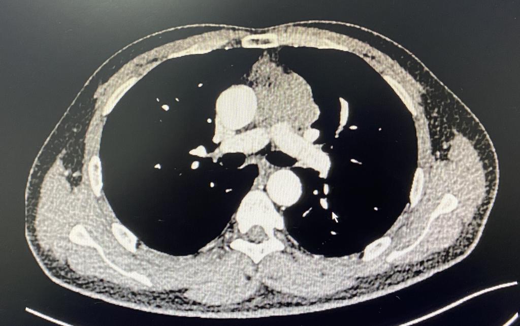 此位男性患者因声音嘶哑2月就诊,行胸部CT提示前纵膈可见不规则软组织密度,与主动脉弓、肺动脉主干和左肺上叶分界不清,大小约64mm x 18mm,于外院行穿刺活检示胸腺肿瘤,结合免疫组化考虑B型或AB型胸腺瘤。因手术难度大,肿瘤与周围重要组织和脏器关系密切,遂慕名转院来我院胸外科就诊。