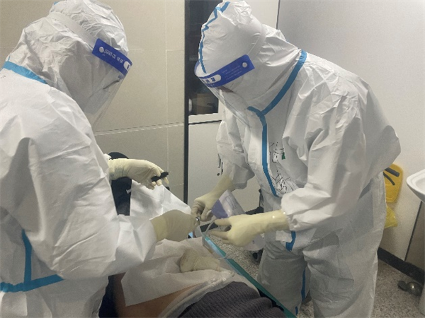 护理组的工作在王园护士长的安排下也在有序开展,由于感控工作的要求,患者和家属不能随意出病房,护理工作除了要进行日常治疗外,还要承担起“服务员”的工作,为患者打热水和送餐,让患者在这特殊的情景下有尽可能舒适的就医体验。