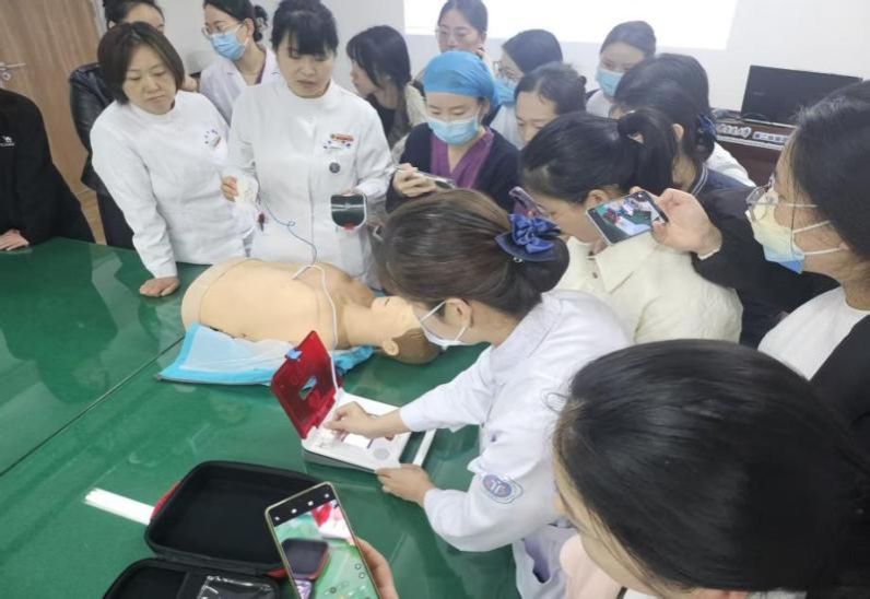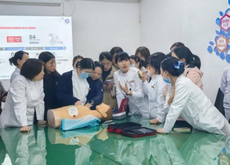 急诊科主管护师朱丹进行AED使用方法的培训,通过对AED适用条件、正确使用方法、注意事项及我院AED分布图的全面分享,并结合模拟人及真实AED设备现场实操,小组成员学以致用,以不断夯实专业急救技能。