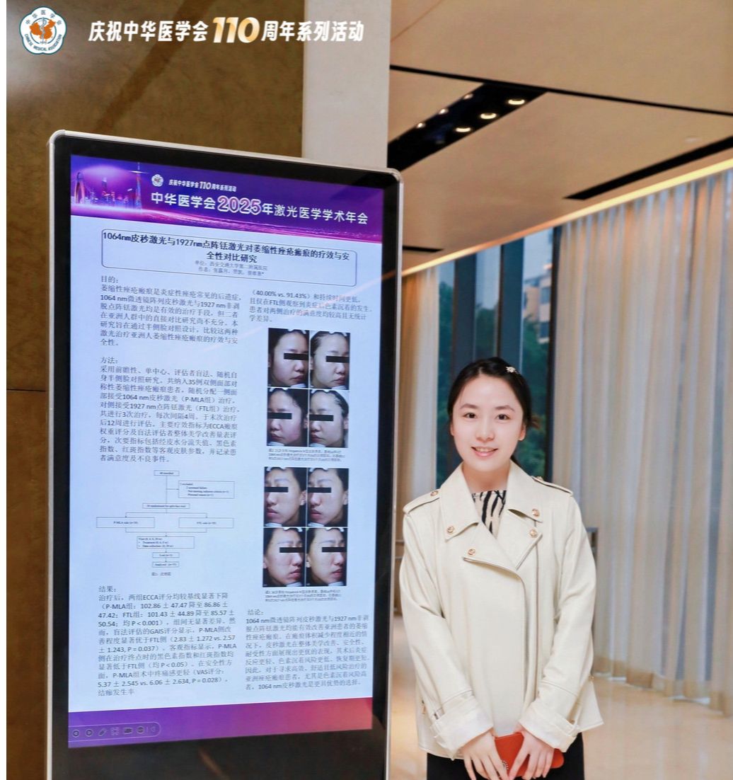 会议期间,我院皮肤科团队全程积极参与。刘晶副教授在多个分会场认真聆听了学术报告,并就血管性皮肤病的光电治疗进展、光生物调节疗法等热点问题与讲者及同行进行了深入交流。研究生张露月广泛汲取新知,开阔科研视野,发表了壁报论文《1064nm皮秒激光与1927nm点阵铥激光对萎缩性痤疮瘢痕的疗效与安全性对比研究》。团队成员的集体亮相与活跃表现,展现了交大二院皮肤科团结协作、求知若渴的团队风貌。
