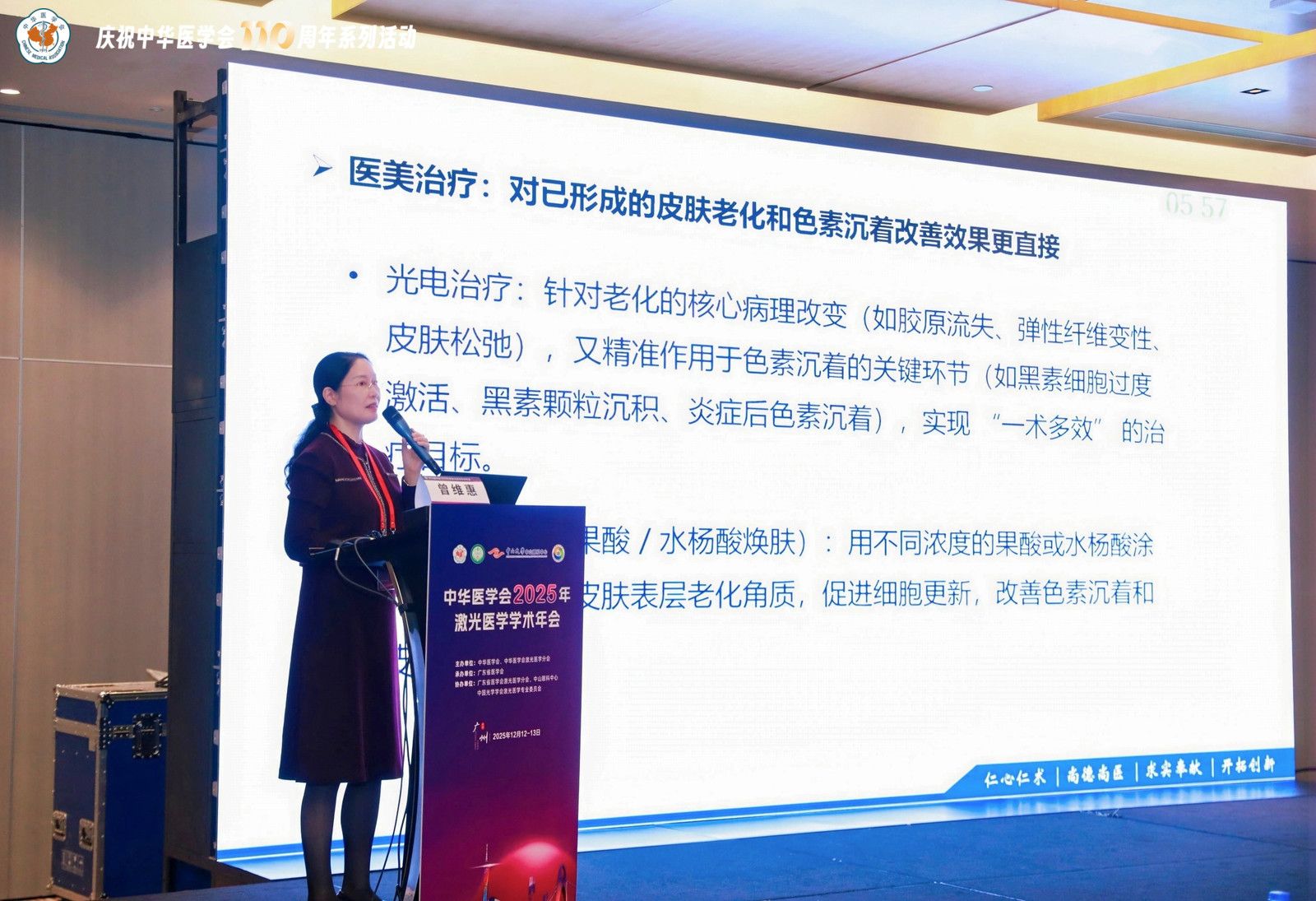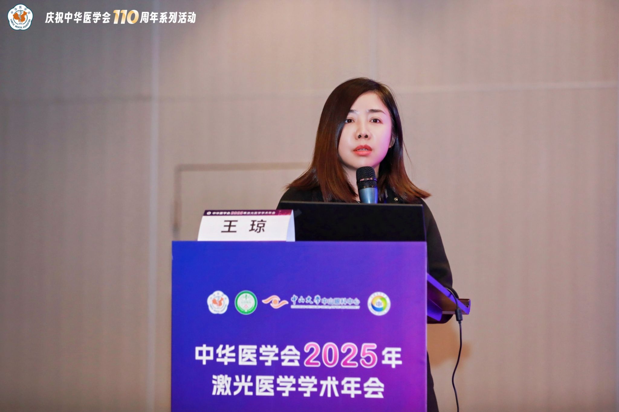 中华医学会激光医学分会副主任委员、西安交通大学第二附属医院曾维惠教授主持皮肤美容整形专场,并率先做《皮肤老化与色素紊乱的关联及光声电的管理策略》大会专题报告。报告系统阐述了皮肤老化与色素紊乱的相关性,提出了基于抗衰的色素性皮肤病的综合治疗方案。其严谨的科研设计、创新的治疗理念及显著的临床疗效,获得了与会专家的一致高度评价。王琼副教授在美容整形学组会场作了《中胚层疗法联合光电技术治疗面部损容性疾病的临床疗效观察》的精彩发言。她详细介绍了针对肤色、肤质、皮肤炎症、皮肤抗衰等问题的个性化、序贯化联合治疗方案。
