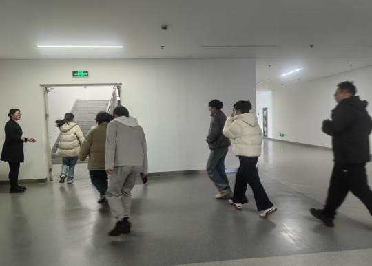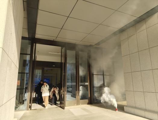 随后紧急警报声响起,烟雾弥漫,应急疏散演练正式启动。安全员曲首霏等工作人员立即到位,研究院师生迅速响应,严格按照疏散流程,弯腰捂鼻、低姿前行,沿着预定安全路线快速、有序撤离至指定集结区域,全程行动规范、秩序井然,高效完成疏散任务。